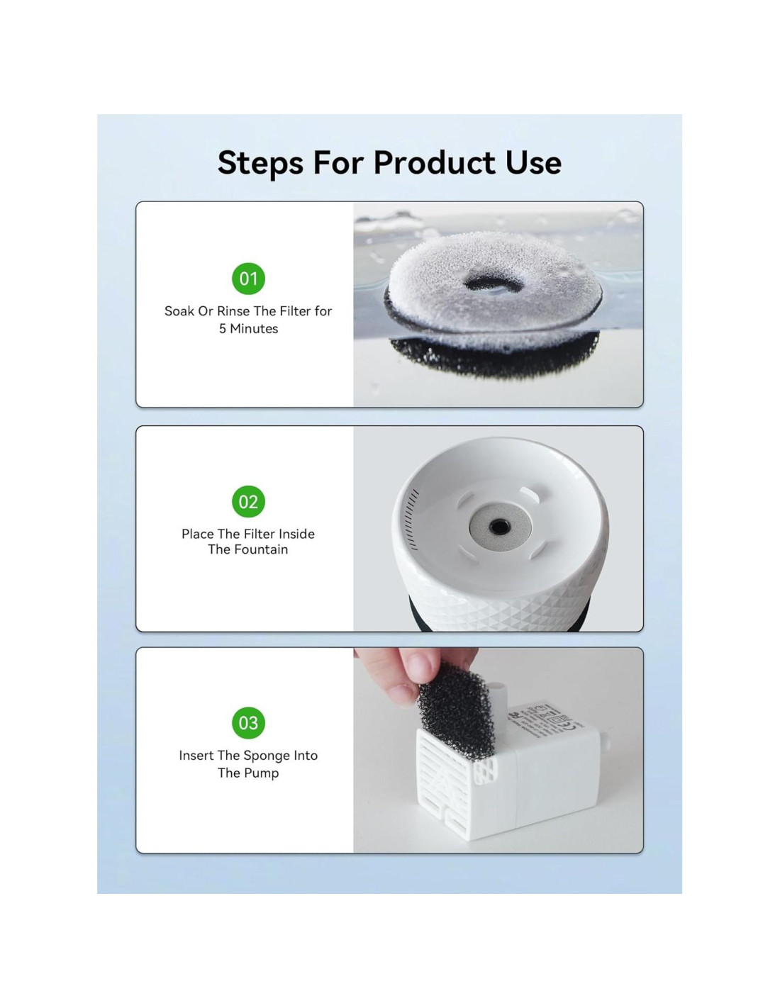- Consejos para el Cuidado y Uso: Se recomienda que el filtro se limpie una vez a la semana y se reemplace cada 2 semanas para mantener la filtración. Por favor, remoja o enjuaga en agua de limpieza durante 5 minutos antes de usar y el filtro debe instalarse con el lado blanco hacia arriba.