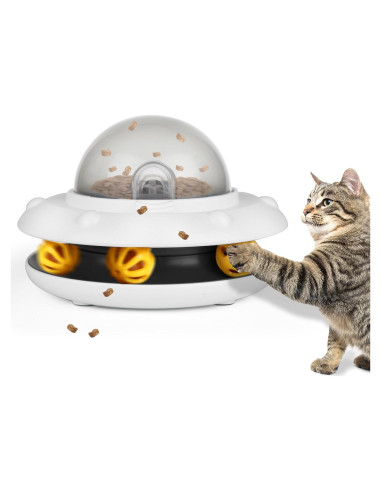 - Comedero Interactivo en Forma de UFO Innovador: Este comedero lento 2-en-1 combina un rompecabezas de alimentos con un juguete de bola de seguimiento interactivo, inspirado en la popular Torre de Bolas para Gatos. Promueve hábitos de alimentación más saludables mientras mantiene a tu gato entretenido y mentalmente estimulado