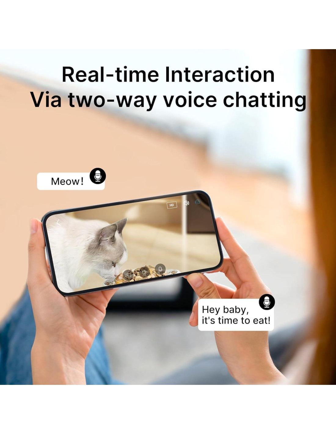 - [Cámara HD 1080P] Incluso cuando estás en el trabajo o fuera, el dispensador de golosinas para gatos con cámara asegura que puedas alimentar a tus mascotas según tu horario, ofreciéndote video y audio de alta resolución de la hora de la comida de tu mascota. Benefíciate de la grabación de video en tiempo real y capacidades de instantáneas que brindan tranquilidad y capturan recuerdos preciados