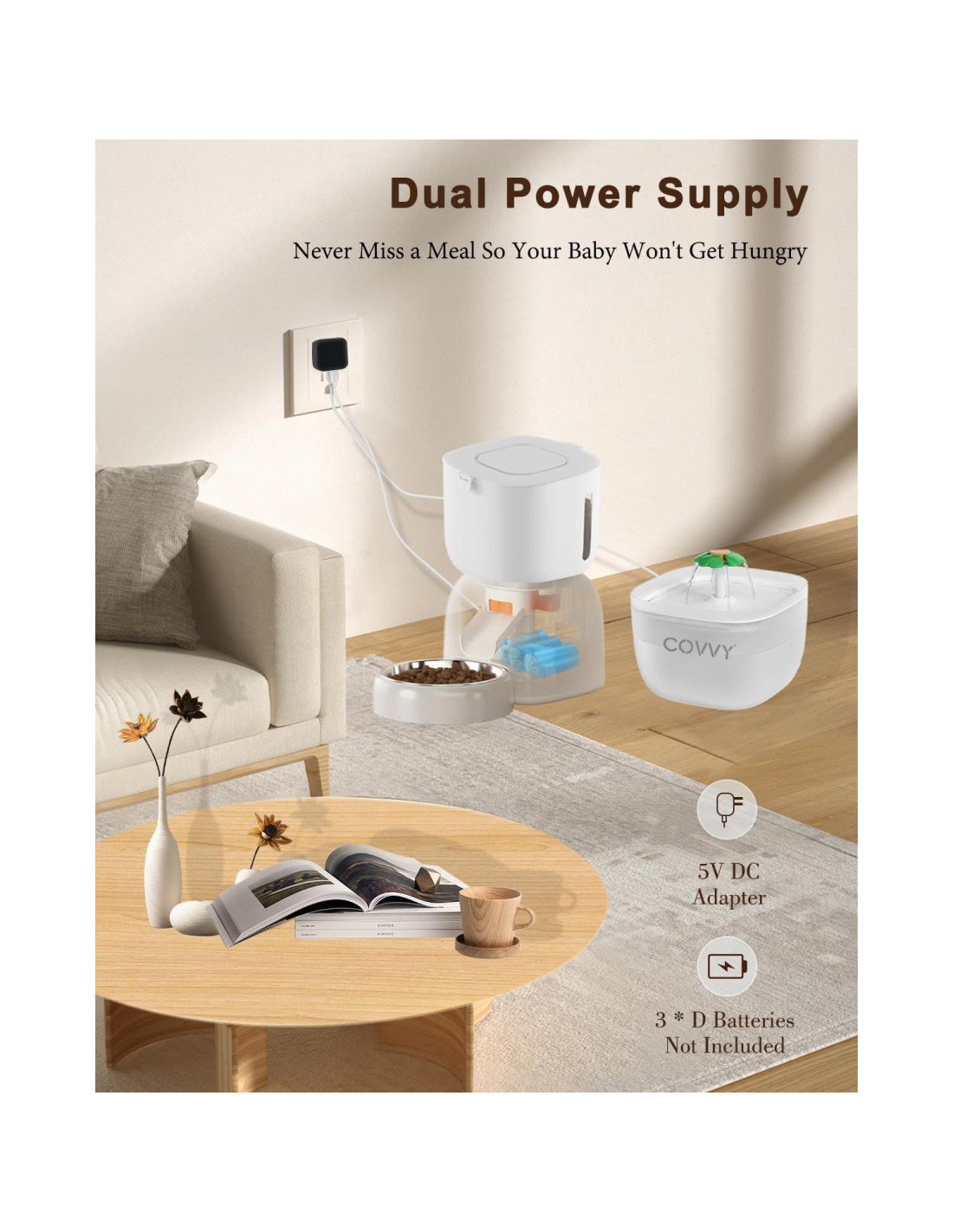 - [Doble Fuente de Alimentación] Funciona con adaptador de 5V DC y 3 baterías alcalinas tamaño D (no incluidas) que tienen una vida útil de 180 días, nuestro dispensador automático de comida para gatos con temporizador inteligente no teme a los cortes de energía. Asegura que tus mascotas queridas obtengan un suministro constante de comida, coman a tiempo y estén saludables