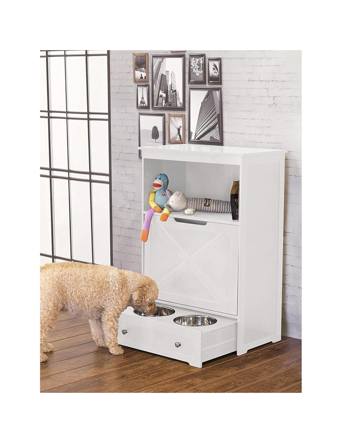 Color: Blanco Esta estación de alimentación todo en uno es la adición perfecta para una casa con mascotas. El panel frontal en X es muy elegante y seguramente te dará a ti y a tu amigo peludo muchos cumplidos. La parte inferior cuenta con un cajón extraíble con dos tazones de acero inoxidable que se pueden quitar fácilmente para limpiar. Justo encima, hay un canal plegable para comida extra, lo que hace que servir las comidas de tu mascota sea muy fácil. La estantería superior proporciona almacenamiento adicional para una variedad de artículos, que van desde juguetes para morder hasta libros. Para rematar, se han montado tres ganchos en un lado de la unidad para colgar cucharas, correas u otros accesorios para tu mascota. Hecho completamente de MDF con un acabado pintado duradero, esta pieza seguramente adornará tu hogar durante mucho tiempo.