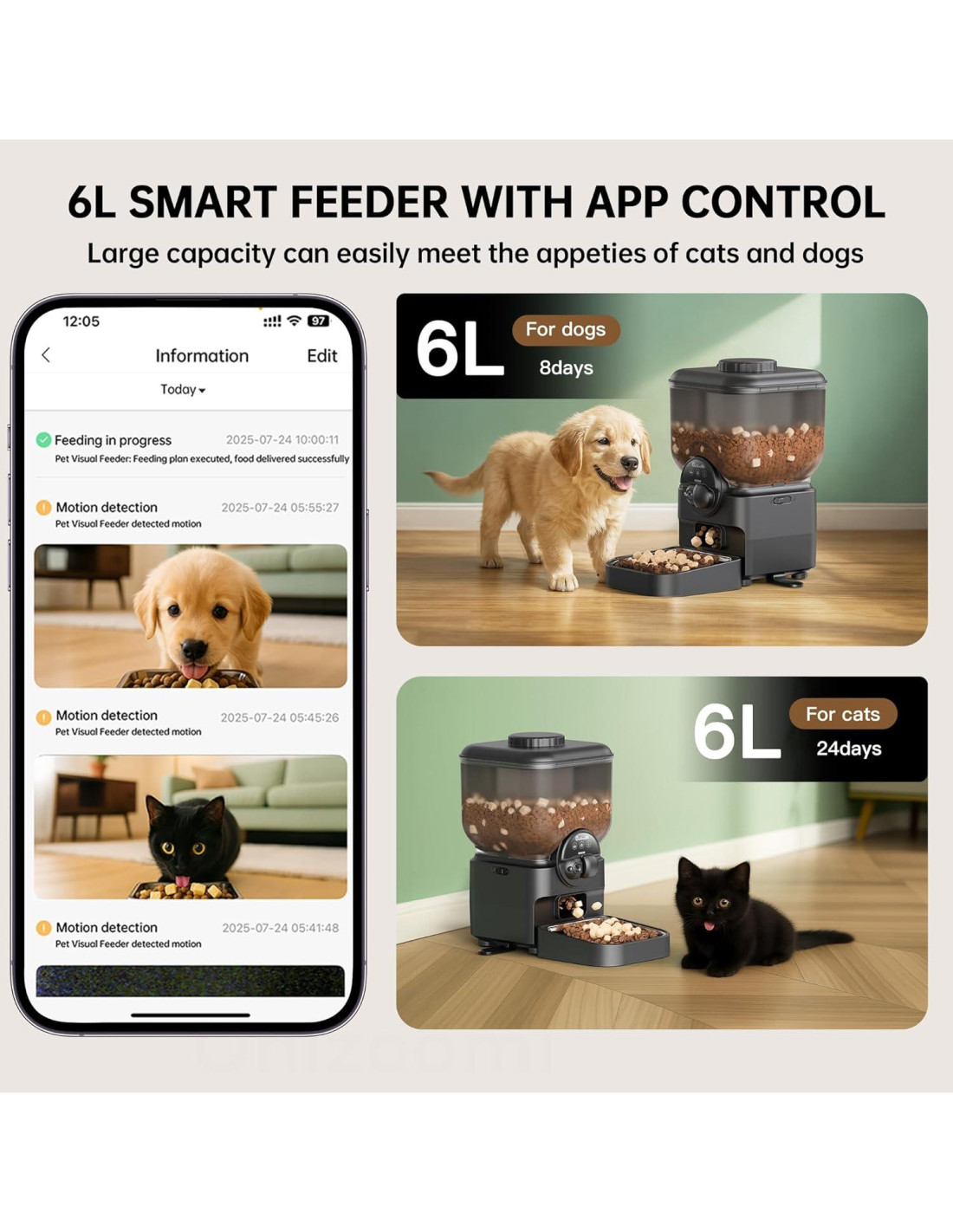 - Almacenamiento Grande de 6L para Comida Seca y Control de Múltiples Porciones El autofeeder electrónico de 6L alimenta a un solo gato durante aproximadamente 24 días, o 8 días (razas de perros medianos) con dispensación automatizada precisa. Gestiona fácilmente los horarios de alimentación a través de la función de temporizador de la app. El dispensador de comida para gatos adecuado para golosinas, croquetas o hogares con múltiples gatos. La tapa sellada mantiene la comida seca y, cuando se combina con un deshidratante, previene la humedad.