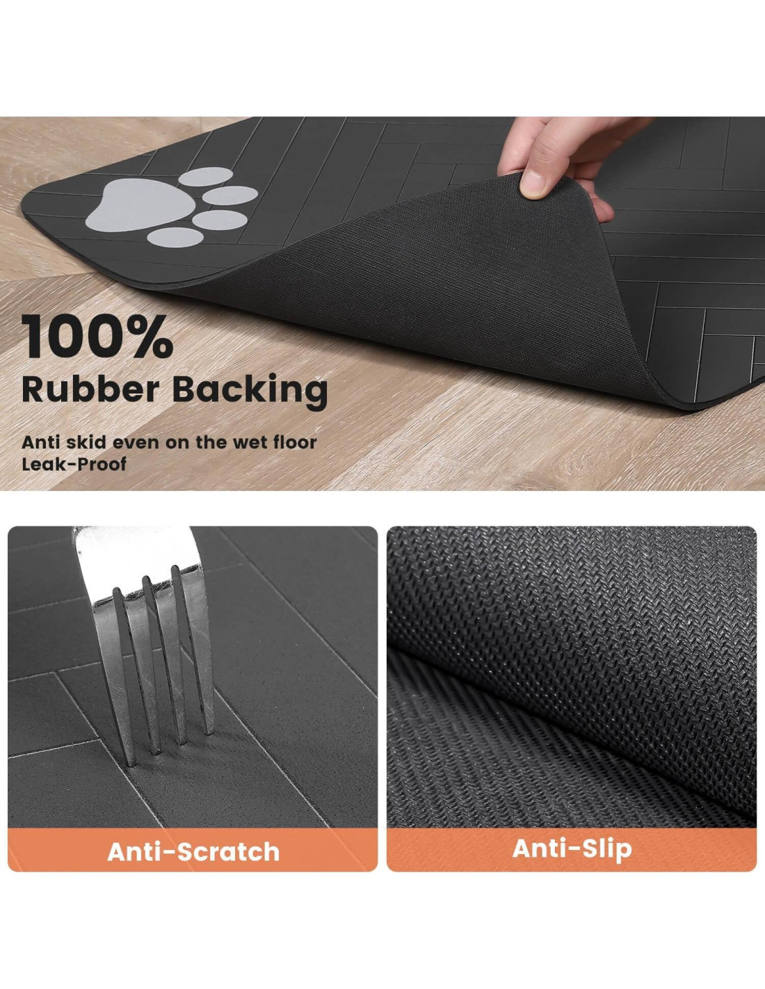 - [Antideslizante y a Prueba de Fugas] Nuestra alfombrilla para cuencos de perro cuenta con un respaldo de goma antideslizante que mantiene su posición de manera segura. El fondo de goma impermeable proporciona una excelente protección contra fugas, evitando que el agua se filtre en el suelo y cause daños.