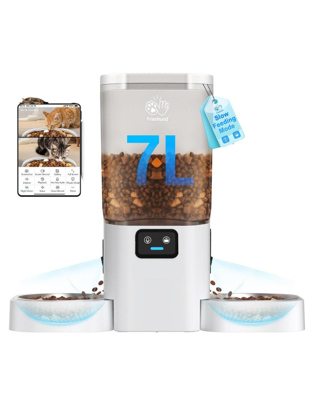 - Amantes de las Mascotas: Frienhund ofrece una garantía gratuita de un año y servicio en línea 24/7 para nuestros comederos automáticos para 2 gatos. El comedero automático para gatos está diseñado para todos los amantes de las mascotas como yo, si tienes algún problema, puedes contactarnos por pedido, correo electrónico o teléfono. Resolveremos tu problema hasta que esté solucionado.