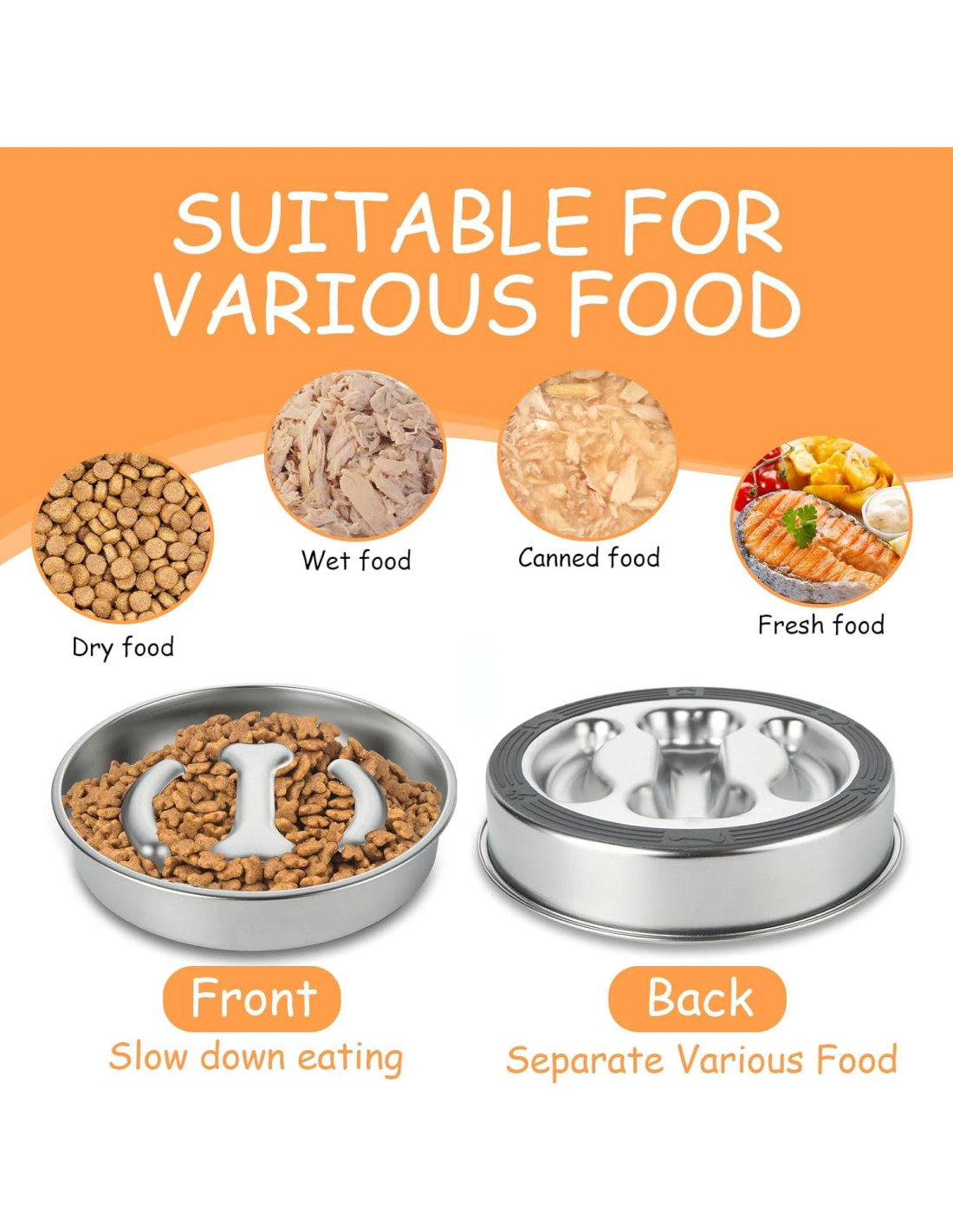 - DISEÑO DE ALIMENTACIÓN LENTA: El cuenco para perros de alimentación lenta presenta un diseño de alimentación lenta que reduce la velocidad de alimentación, resuelve el problema de la retención de aliento y ayuda en la digestión, especialmente para cachorros que pueden devorar su comida. Los cuencos de acero inoxidable para perros de alimentación lenta ayudan a prevenir que los perros coman demasiado rápido, lo que puede llevar a obesidad excesiva e indigestión, permitiendo que tu perro coma más lento y de manera más saludable.