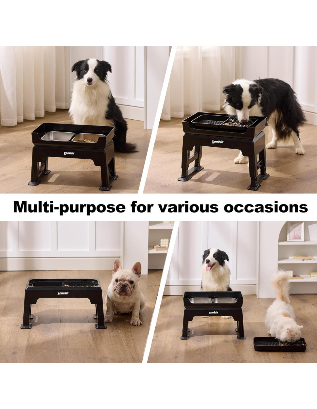 - Diseño Multifuncional 3-en-1 y Capas Desmontables: Presenta una estructura de doble nivel única. Desmonta fácilmente el nivel superior con dos cuencos de acero inoxidable de gran capacidad para comida/agua. Al quitarlo, se revela el nivel inferior: un plato con un comedero lento en un lado y un plato de lamer en el otro para comida húmeda o golosinas. Ambos niveles utilizables por separado. Versatilidad de alimentación definitiva en un soporte.