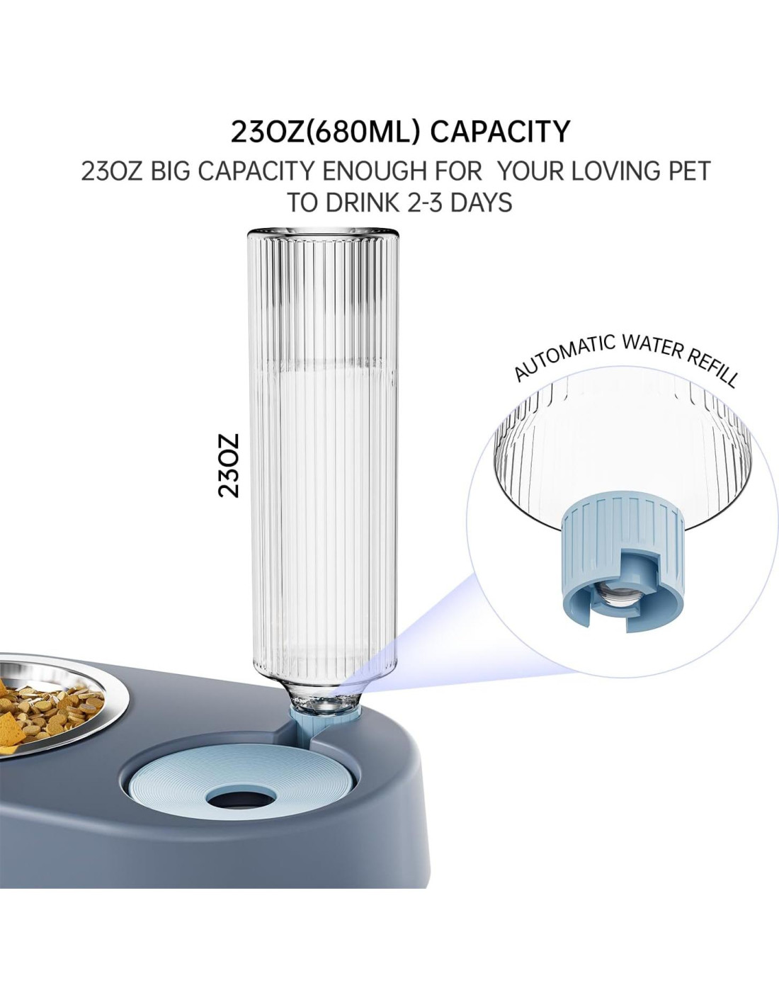 - [La gran botella de agua] Principio de sifón, control estable del nivel de agua, suministro automático de agua. Esta botella de agua puede contener 680ml de agua. El dispensador automático de agua podría rellenar el agua en el plato automáticamente y mantener el agua llena. Este diseño es muy útil para tus adorables gatos cuando no estás en casa (cambiar el agua una vez al día puede hacer que tu mascota beba de manera más saludable!).
