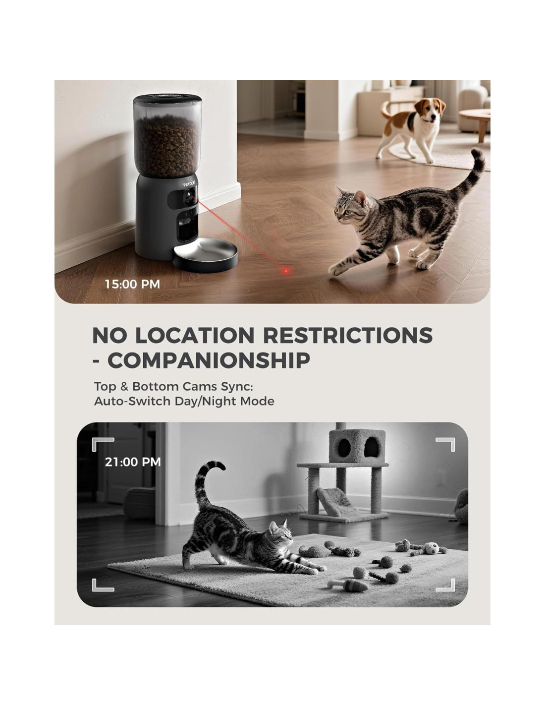 - [Doble Cámara HD 2K]: 1 cámara fija de 120 de gran angular monitorea la comida en el tazón, 1 cámara AI ajustable de 180 para visualización de mascotas en múltiples ángulos. Chip AI integrado reconoce inteligentemente a las mascotas y envía alertas de actividad a tu teléfono; visión nocturna infrarroja asegura grabaciones claras de día y de noche.