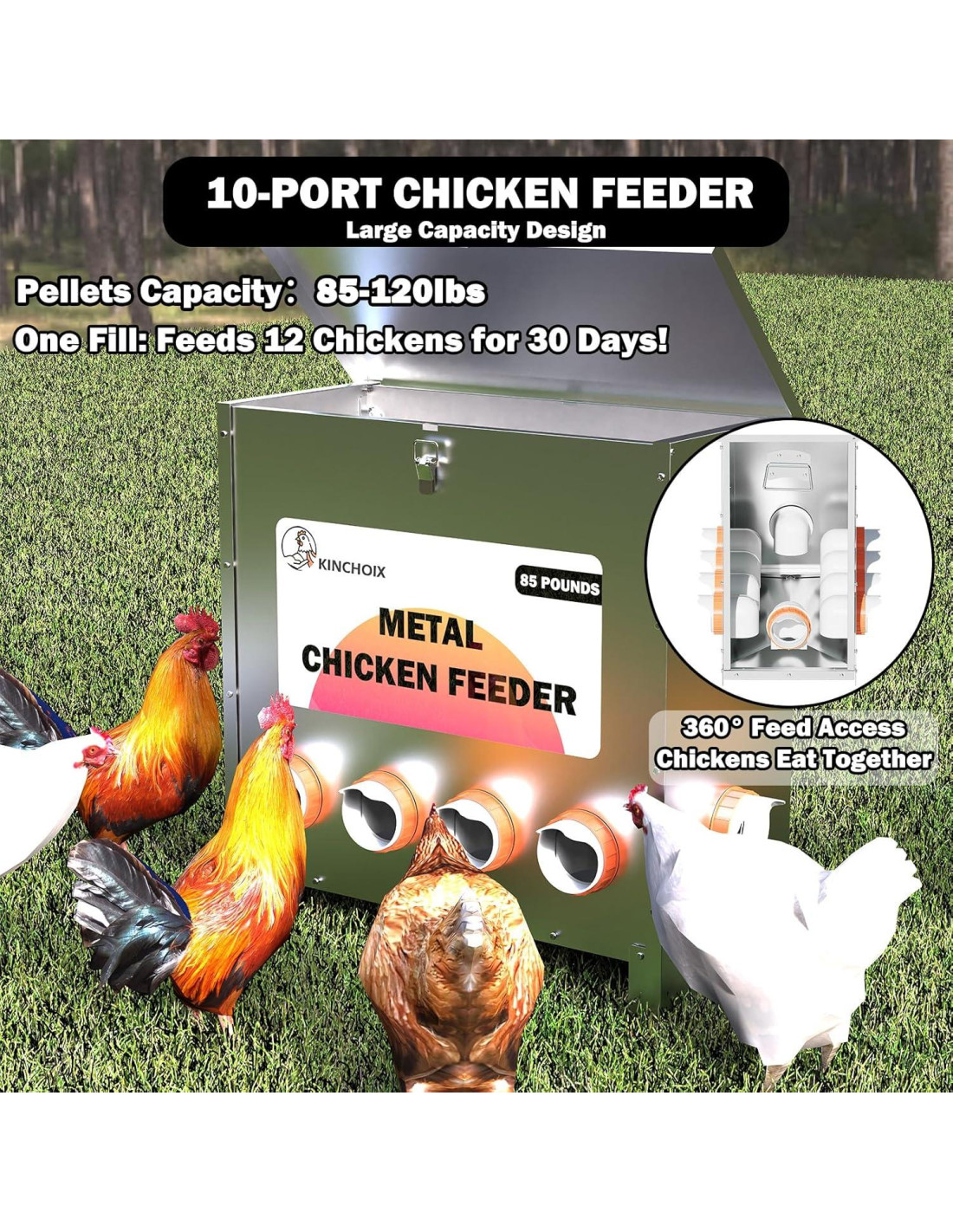 - Gran Capacidad: ¡Menos llenados para un fácil mantenimiento! El comedero sostiene 38.56kg de pellets, puede proporcionar a 10 gallinas adultas 30 días de ingesta de alimentos, migajas o granos de rasguño. Monta este comedero dentro de un gallinero o colócalo afuera de pie por sí mismo.