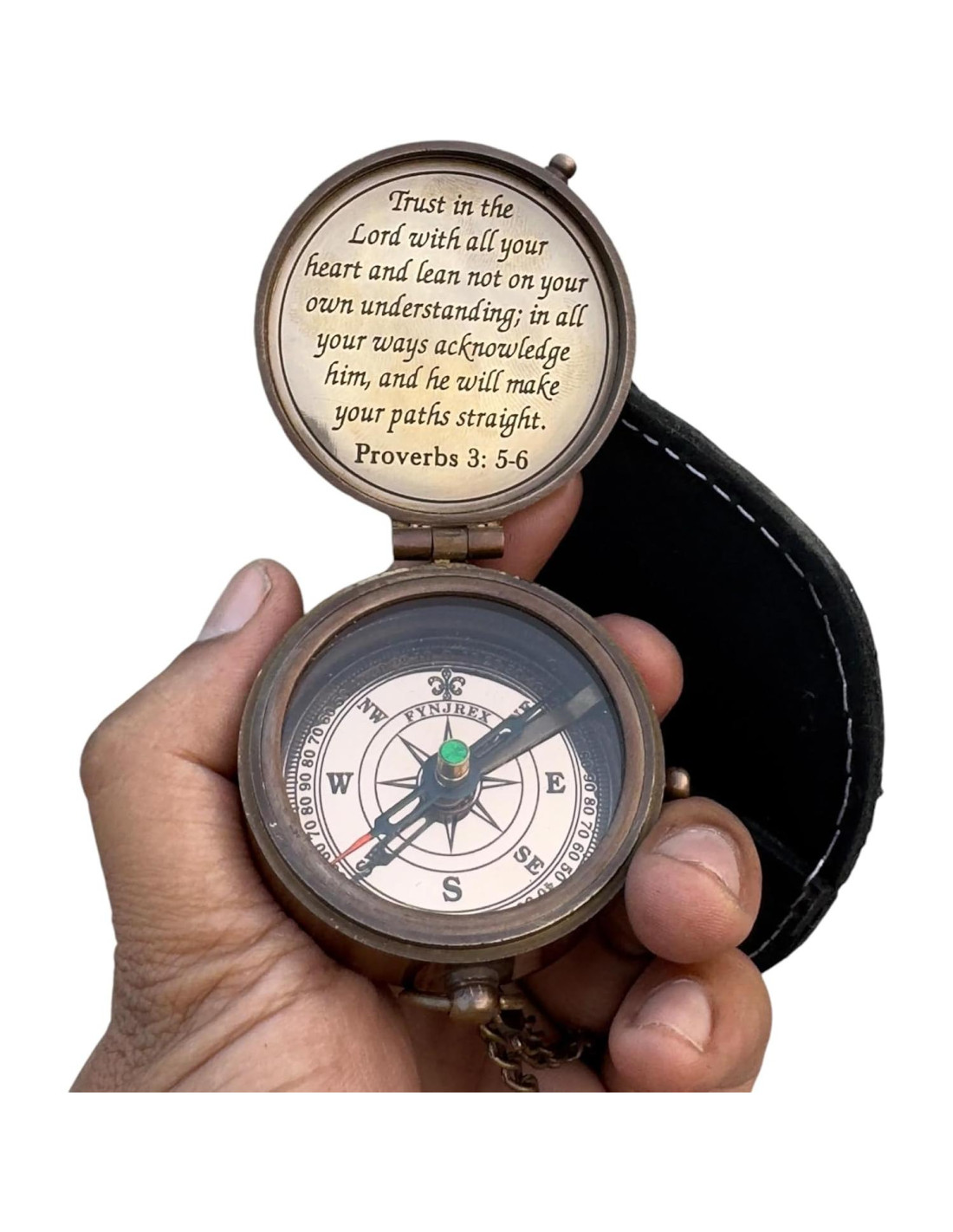 - Este Compás Funcional Confía en el Señor con acabado antiguo incluye un compás de bronce hecho a mano de calidad premium y funda de cuero. Proverbios 3: 5-16 grabado en el lado interior del compás.