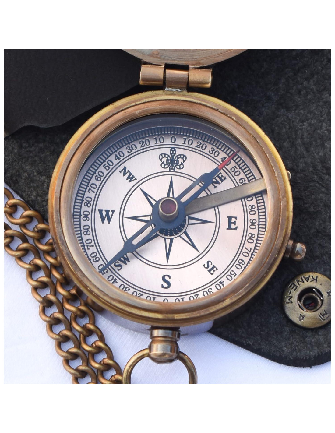 - Compás Totalmente Funcional. TAMAÑO: Compás: 6.35 x 5.08 x 2.03 centímetros. Material Utilizado: Bronce, Funda de Cuero y Cadena de Bronce. Compás de bronce hecho a mano de calidad premium y funda de cuero.