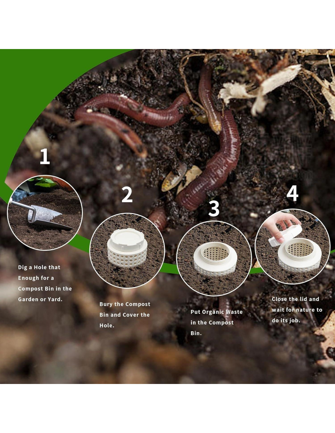 - Sin Complicaciones y Sin Esfuerzo: No es necesario voltear o mezclar - la configuración subterránea del bin permite un proceso de compostaje natural y de bajo mantenimiento. Simplemente agrega desechos orgánicos y deja que los gusanos hagan el trabajo. Es una excelente manera de reducir desechos sin el esfuerzo de los métodos tradicionales de compostaje.
