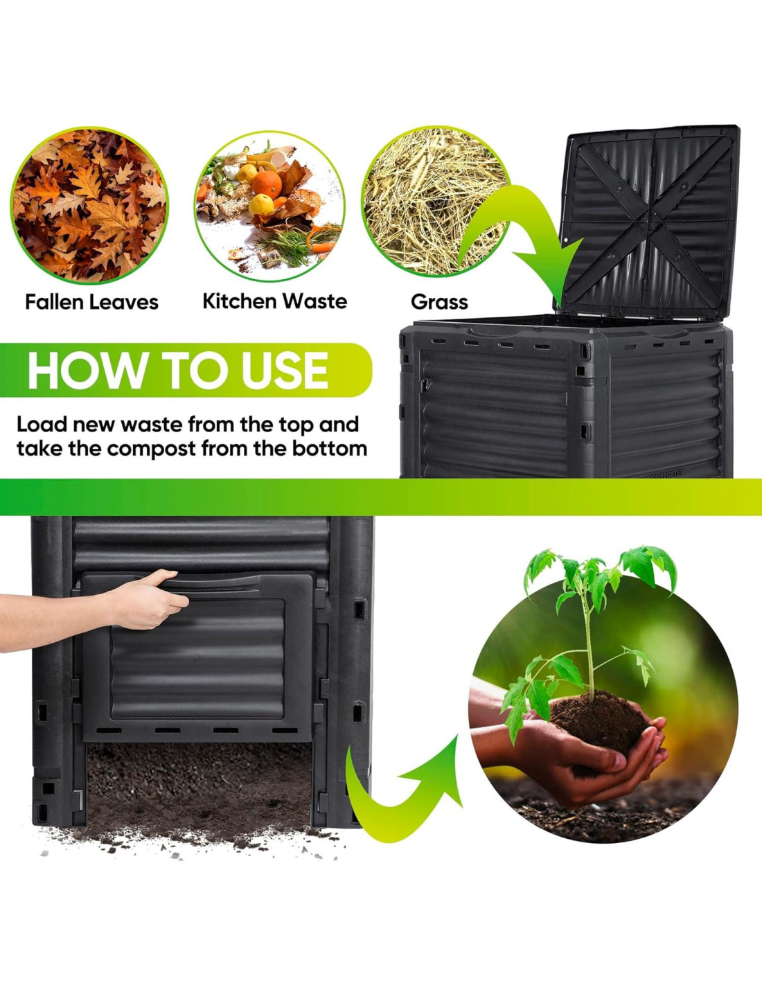 - Material Libre de BPA - Hecho de materiales gruesos libres de BPA, en comparación con otros productos, este compostador es más ecológico y puede soportar el exterior y los inviernos más fríos. Además, el plástico PP negro mantiene eficientemente el calor y regula la humedad para obtener un tiempo de compostaje más corto.