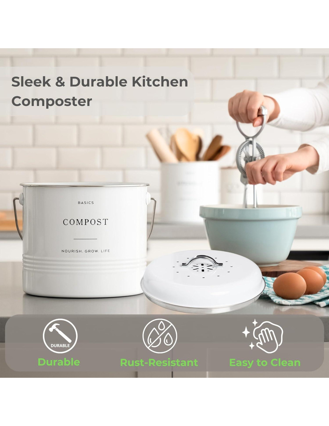 - DISEÑO ELEGANTE Y DURADERO: Hecho de acero galvanizado de alta calidad con recubrimiento en polvo, el contenedor de compostaje es resistente a la oxidación, fácil de limpiar y se integra perfectamente en cocinas modernas para una solución elegante y práctica.