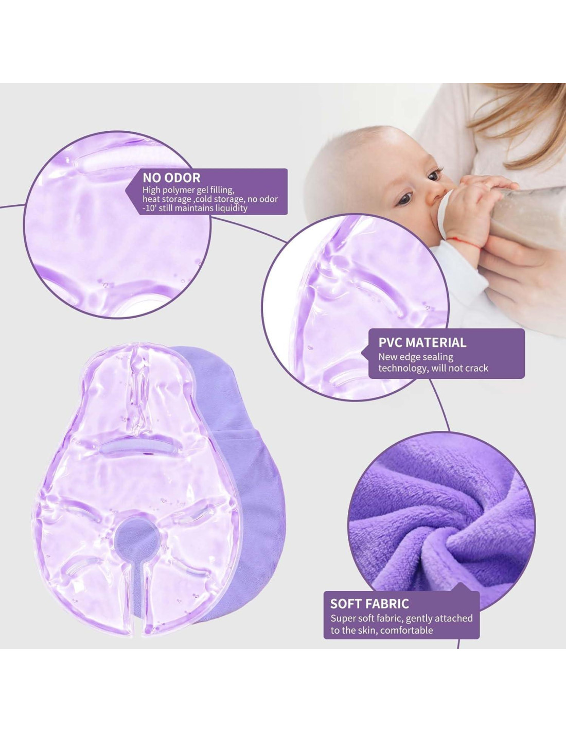 - Múltiples Usos: Las compresas para el pecho se pueden usar para la distensión mamaria, proporcionando alivio frío o caliente, reduciendo el dolor, conductos bloqueados y mastitis. También se puede usar para hemorroides, hinchazón y dolor, o para aliviar el enrojecimiento y fiebre causados por trauma