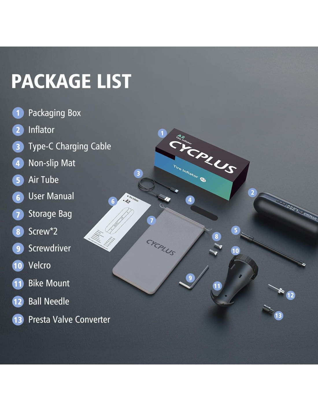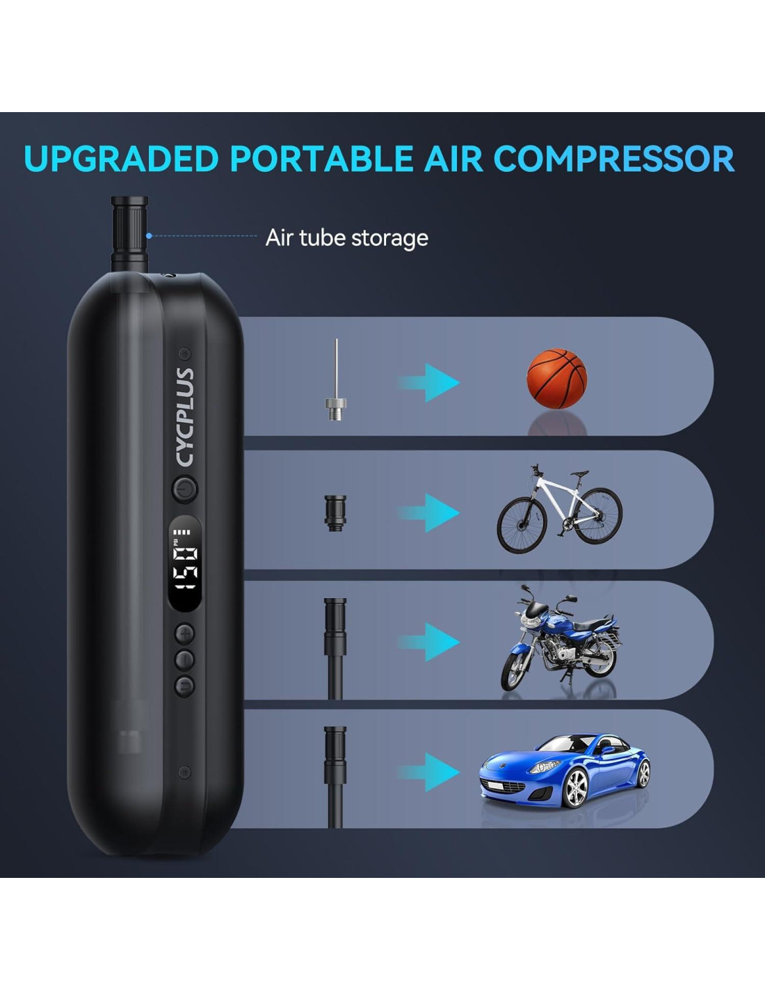- 150PSI Inflación Rápida CYCPLUS Compresor de Aire Portátil entrega 150 PSI/10.3 Bar, permitiéndote inflar completamente un neumático de bicicleta en solo 2 minutos. Viene con adaptadores de válvula Presta y Schrader, así como una aguja para pelotas, haciéndolo compatible con bicicletas de montaña, bicicletas de carretera, motocicletas, neumáticos de coches y pelotas deportivas.