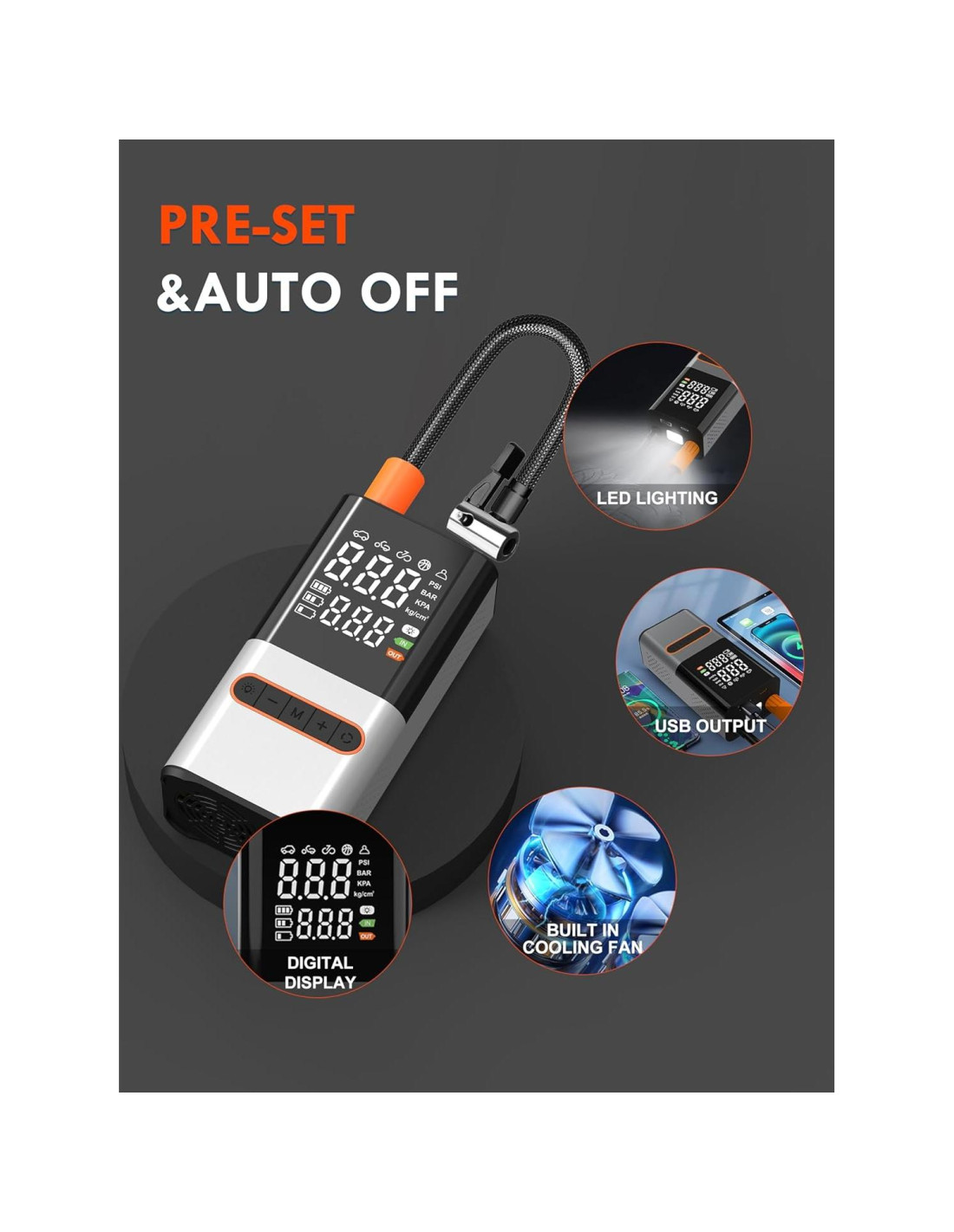 - PANTALLA DIGITAL DE PRESIÓN DE NEUMÁTICOS PRECISA: Compresor de Aire para Coche con Pantalla Digital del Inflador para Ajustar con Precisión la Presión de Aire Deseada. Apagado Automático al Alcanzar el Valor Preestablecido, Sin Riesgo de Sobreinflado
