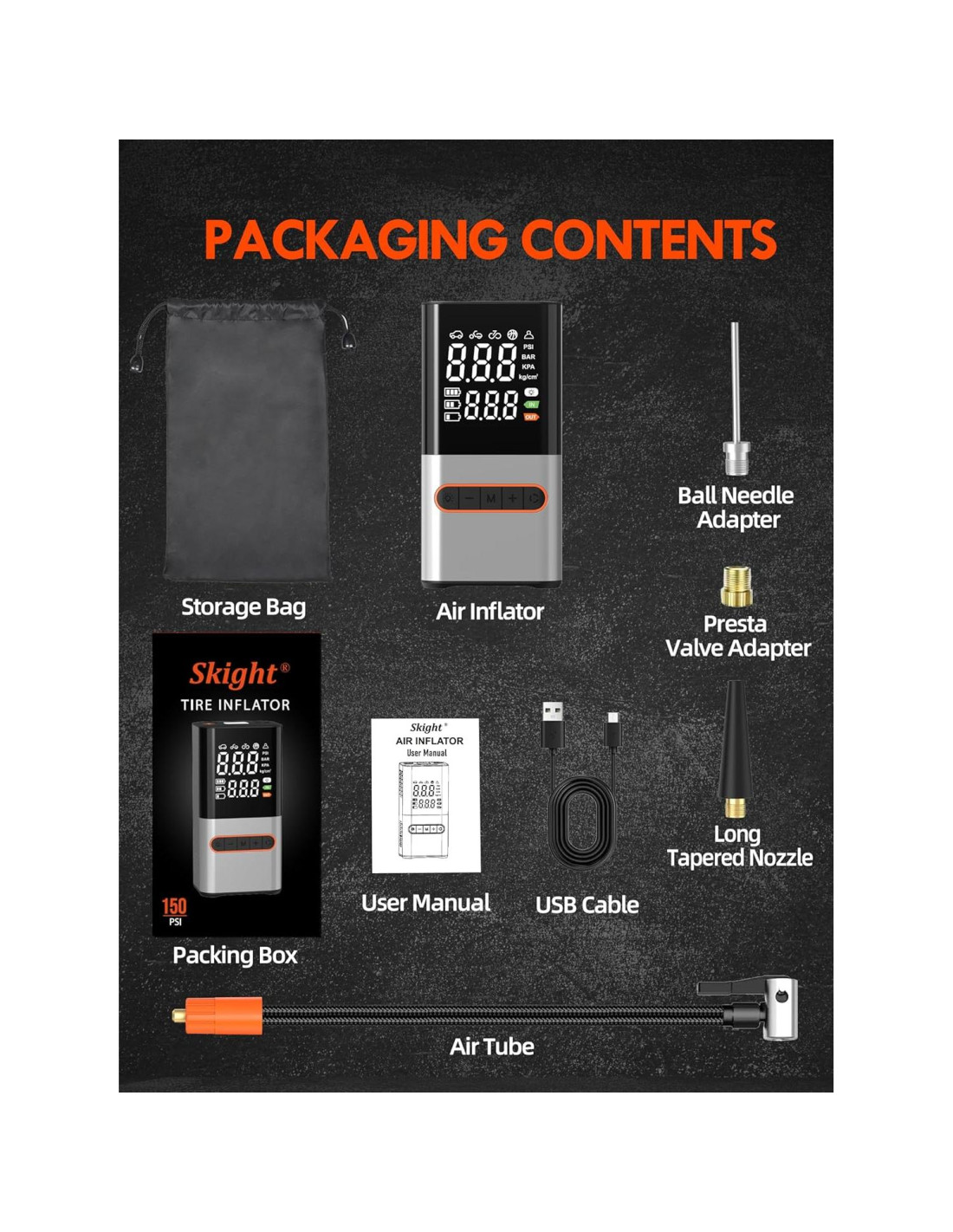 - TUBO DE AIRE NYLON CON SNAP-ON Y LUZ Y CARGA; Bomba de Aire Portátil con Tubo de Aire Snap-On, Inflado y Desinflado Rápido, Resistente al Calor de Nylon. Luz LED Incorporada de 3 Modos Proporciona Comodidad para Inflar y Cambiar Neumáticos en la Oscuridad. Inflador de Neumáticos Portátil con Entrada Tipo-C de 5v/2a y Puerto de Salida USB de 5v/2a, Haciéndolo una Fuente de Energía de Emergencia