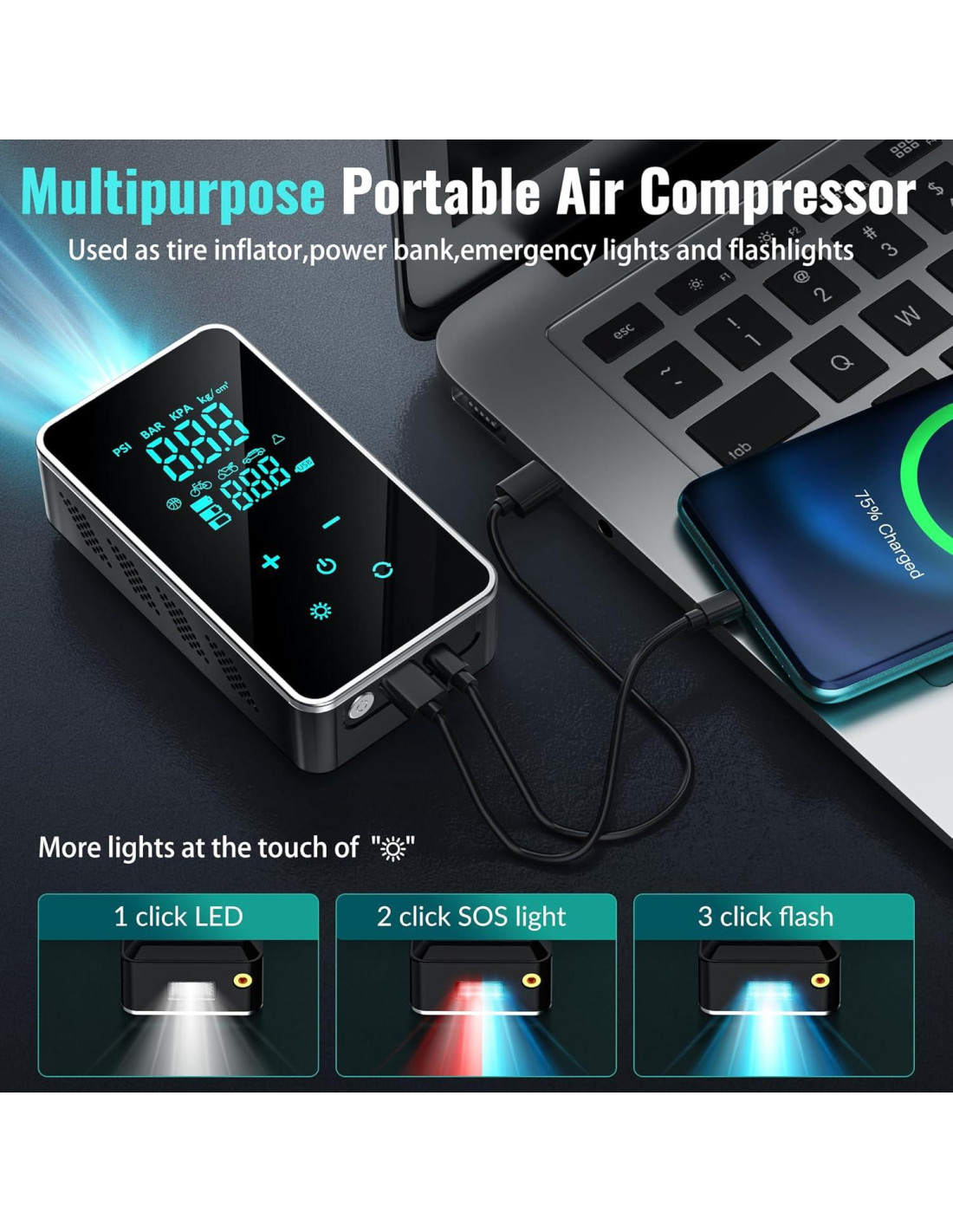 - Inflador de neumáticos: uso multifuncional, monitoreo en tiempo real de los valores de presión: precisión de medición de hasta +/-1.5PSI; 3 tipos de luces, LED, SOS, luces intermitentes. Fácil de inflar en la oscuridad; Energía móvil: puerto de entrada USB-C y puerto de salida USB-A, puede usarse como fuente de energía de emergencia para otros dispositivos electrónicos