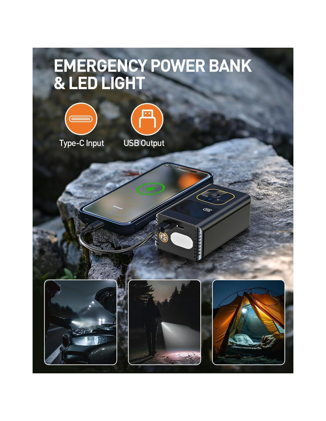 - Carga Tipo-C, Banco de Energía, Luz LED: Este inflador de neumáticos compresor de aire portátil se carga rápidamente utilizando Tipo-C para una recarga eficiente. También sirve como un banco de energía.