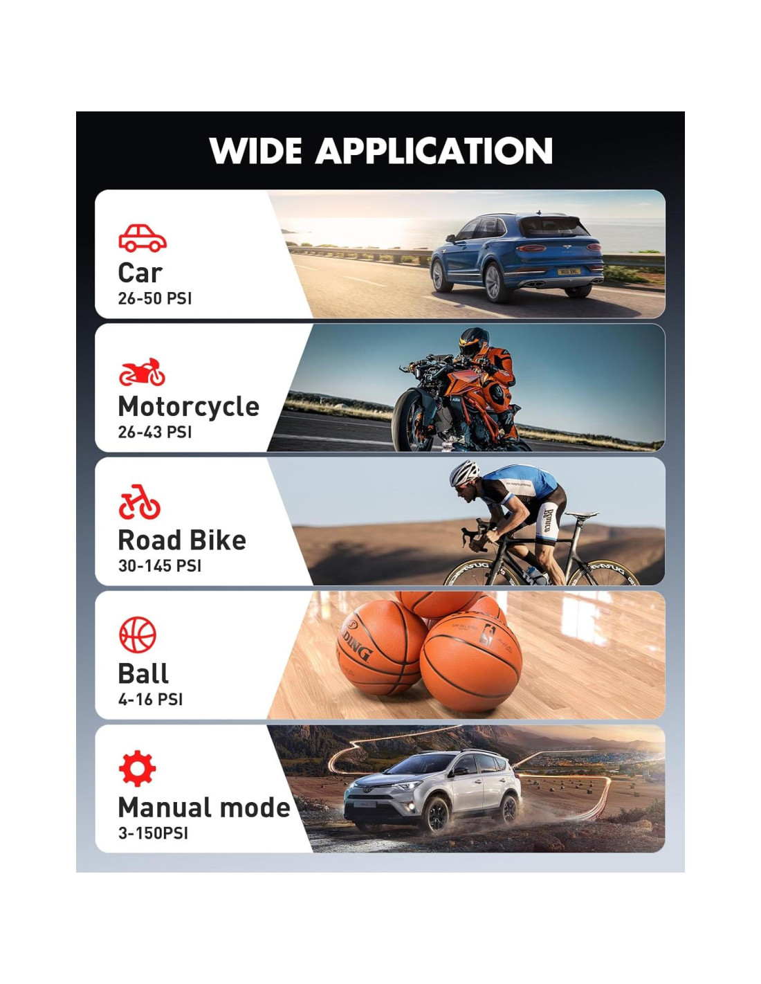 - [Pantalla LCD & AUTO-STOP] El compresor de aire portátil Povasee con tecnología de auto-stop confiable, diseño elegante e interfaz fácil de usar, lo que facilita el monitoreo y ajuste según sea necesario. Simplemente establece tu presión deseada y deja que el inflador haga el resto. Una vez que el neumático alcanza el nivel preestablecido, la función de auto-stop se activa, apagando automáticamente el compresor para evitar sobreinflado.