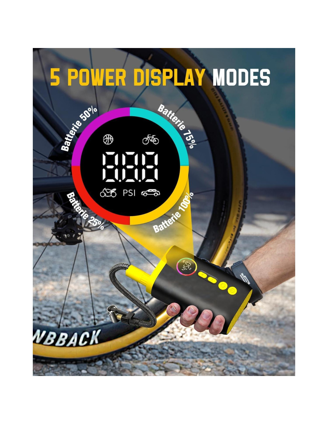 - Doble Alimentación y Larga Duración de Batería El inflador de aire eléctrico para bicicleta utiliza el cargador de coche de 12V y una batería recargable incorporada de 10000mAh (carga tipo C). La luz de trabajo LED proporciona visibilidad en condiciones oscuras.