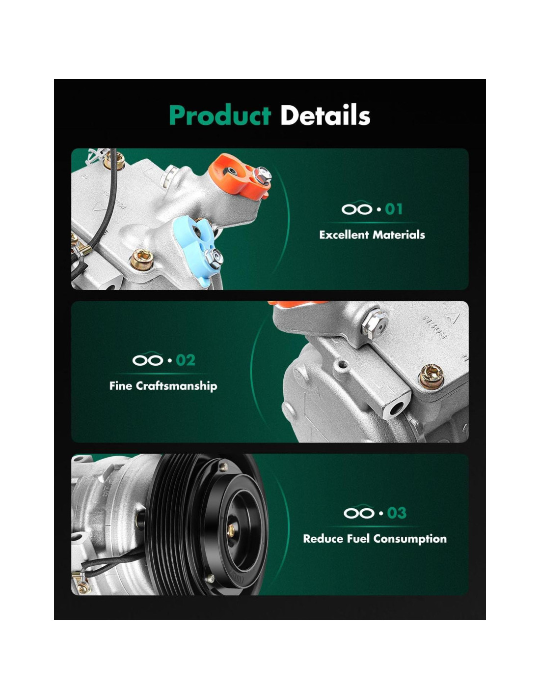 - Ahorro de energía: Nuestro kit de compresor de aire acondicionado funciona de manera eficiente con bajo ruido y vibración mínima para proporcionarte un viaje súper fresco. Conducir a una velocidad estable ayudará a reducir el consumo de combustible. El compresor SCITOO está hecho principalmente de aleación de aluminio de alta resistencia, lo que garantiza un rendimiento confiable y una larga vida útil.