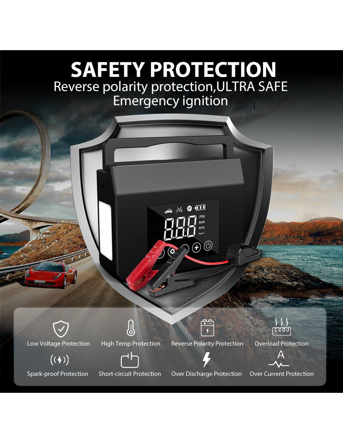 - Cargador de coche, compresor de aire portátil, los arrancadores de coche son compactos y portátiles y se pueden usar para arranques de emergencia, inflado de neumáticos, iluminación, alarma SOS, carga de dispositivos móviles, tecnología de almacenamiento de energía, carga rápida.