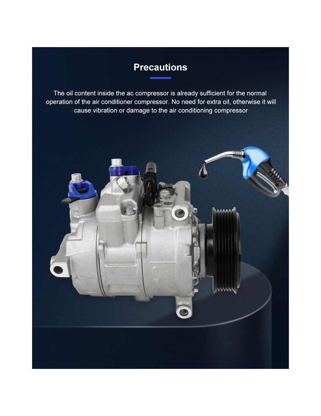 Nuestro compresor de A/C enfría rápidamente, es duradero y de bajo ruido. Por favor, asegúrese de que el sistema de aire acondicionado esté limpio antes de la instalación. El compresor de A/C de ECCPP enfría rápidamente, es de alta calidad, duradero y silencioso. DESCARGO DE RESPONSABILIDAD POR NO INFRACCIÓN PARA VENTAS DE PIEZAS DE AUTOMÓVIL. Dentro de las ventas de piezas de automóvil, tenga en cuenta que todas las menciones de nombres de marcas y modelos son solo para fines de compatibilidad y no deben interpretarse como una indicación de afiliación o respaldo por parte del fabricante original. Nota: Por favor, asegúrese de que el sistema de aire acondicionado esté limpio antes de la instalación. No hacerlo puede resultar en obstrucciones operativas, lo que podría causar un aumento excesivo de la temperatura del compresor y llevar a la fusión de la correa del embrague. 2004-2005 compatible con Audi A3 Quattro 2.0L, 2004-2005 compatible con Audi A3 Quattro 3.2L, 2001-2016 compatible con Audi A4 1.8L, 2005-2007 compatible con Audi A4 2.0L, 2007 compatible con Audi A4 3.2L, 2013-2016 compatible con Audi A4 allroad 2.0L, 2002-2005 compatible con Audi A4 Quattro 1.8L, 2005-2016 compatible con Audi A4 Quattro 2.0L, 2013-2014 compatible con Audi A4 Quattro 3.0L, 2012-2016 compatible con Audi A5 1.8L, 2010-2019 compatible con Audi A5 2.0L, 2015-2016 compatible con Audi A5 3.0L, 2008-2010 compatible con Audi A5 3.2L, 2013-2018 compatible con Audi A5 Quattro 2.0L, 2013-2016 compatible con Audi A5 Quattro 3.0L, 2014-2018 compatible con Audi A8 Quattro 3.0L, 2016 compatible con Audi A8 Quattro 4.0L, 2015-2016 compatible con Audi A8 Quattro 6.3L, 2016 compatible con Audi Q7 3.0L. Tipo de aceite: PAG 46; Contenido de aceite interno 130ml. Ranuras de polea: 6. Tipo de compresor: 6SEU14C. Diámetro de polea (mm): 100. ¿Ya tiene aceite en él? Contenido de aceite interno 130ml, el contenido de aceite por sí mismo ya puede cumplir con el funcionamiento normal del compresor de A/C. Si se agrega aceite a la carga, causará que el compresor vibre o se dañe. ¿Contiene juntas tóricas? No, solo compresor de A/C con embrague.