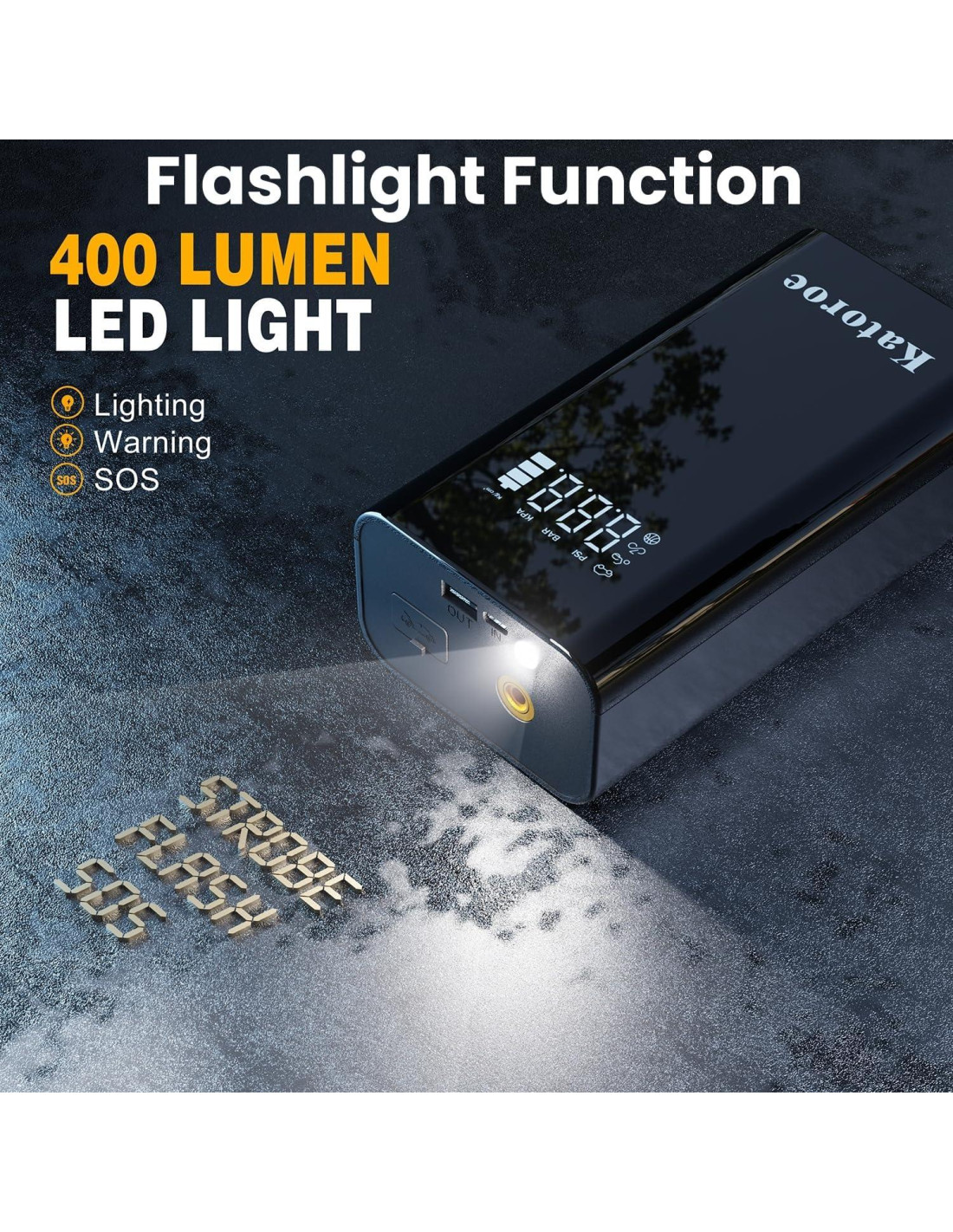 - LUZ DE EMERGENCIA El paquete de batería del arrancador de salto cuenta con luces LED de 400 lúmenes, proporcionando significativamente más del 300% de brillo y puede usarse durante mucho tiempo. Las luces de 3 modos son para diferentes escenarios de emergencia.
