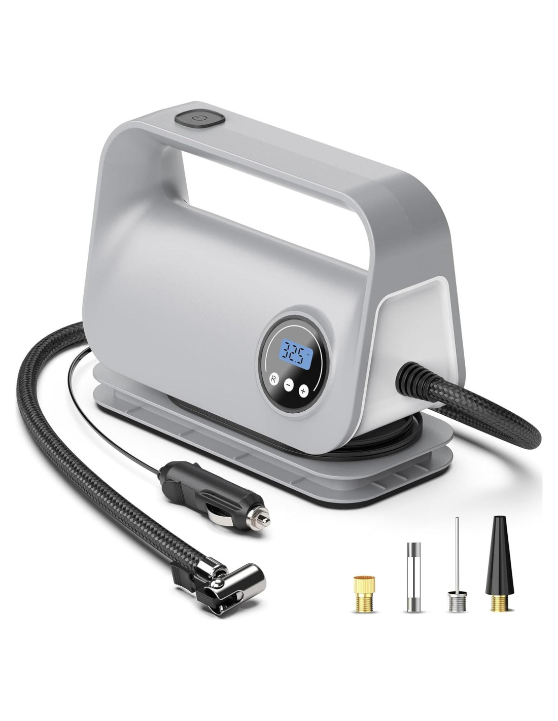 - El Paquete Incluye: El paquete contiene 1* Inflador de Neumáticos DC 12V con Manómetro, 1* Adaptador de Válvula Presta, 1* Adaptador de Aguja de Pelota, 1* Boquilla, 1* Fusible y 1* Manual del Usuario. Adecuado para regalos del Día del Padre, Navidad para hombres, esposos, padres, novios y entusiastas del camping.