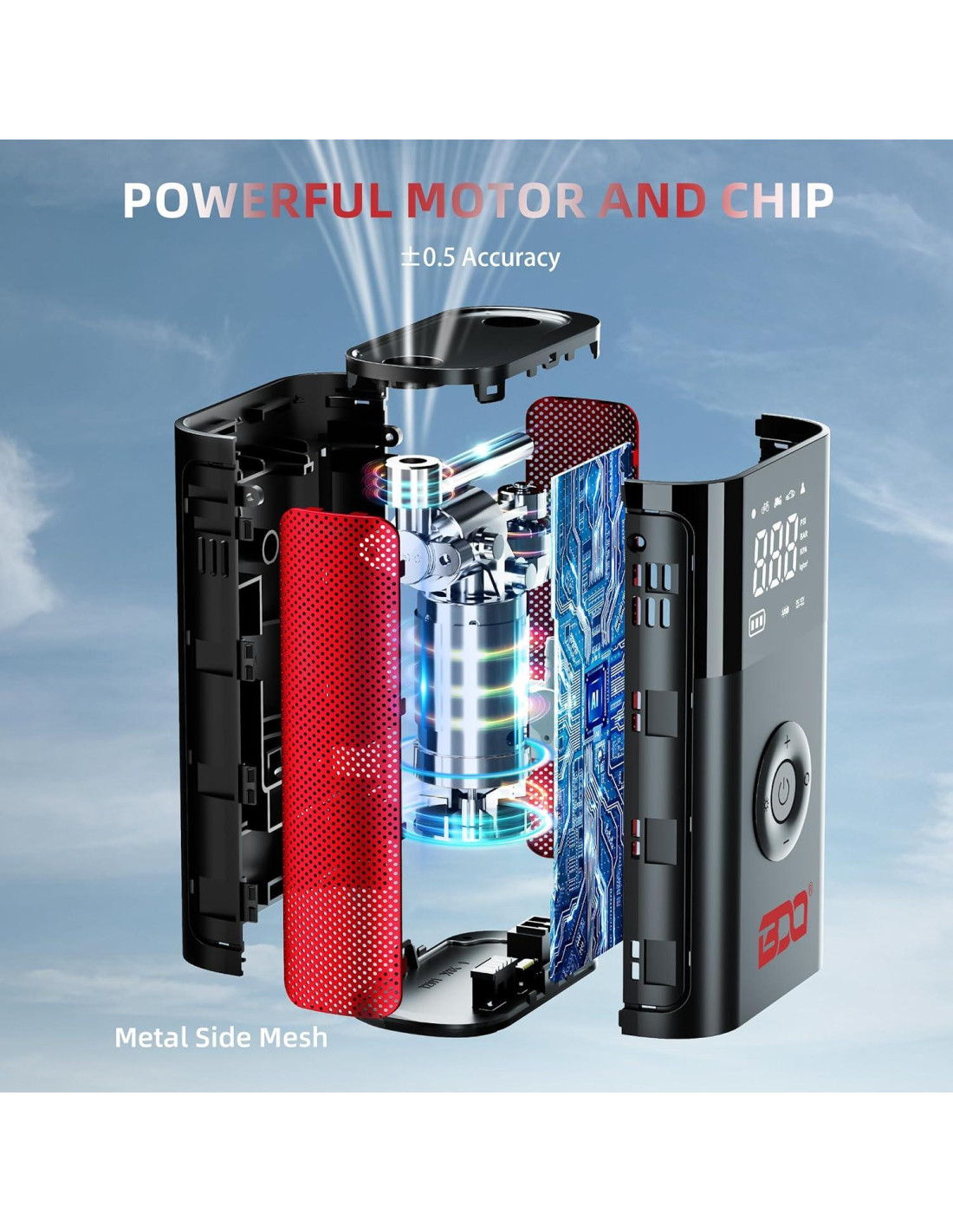 - inflador de neumáticos portátil compresor de aire con chips mejorados integrados, valor de presión más preciso. La pantalla LED muestra el valor de presión en tiempo real y el modo de inflación. La función de apagado automático detiene automáticamente la bomba de aire cuando se alcanza la presión seleccionada, previniendo la sobreinflación.