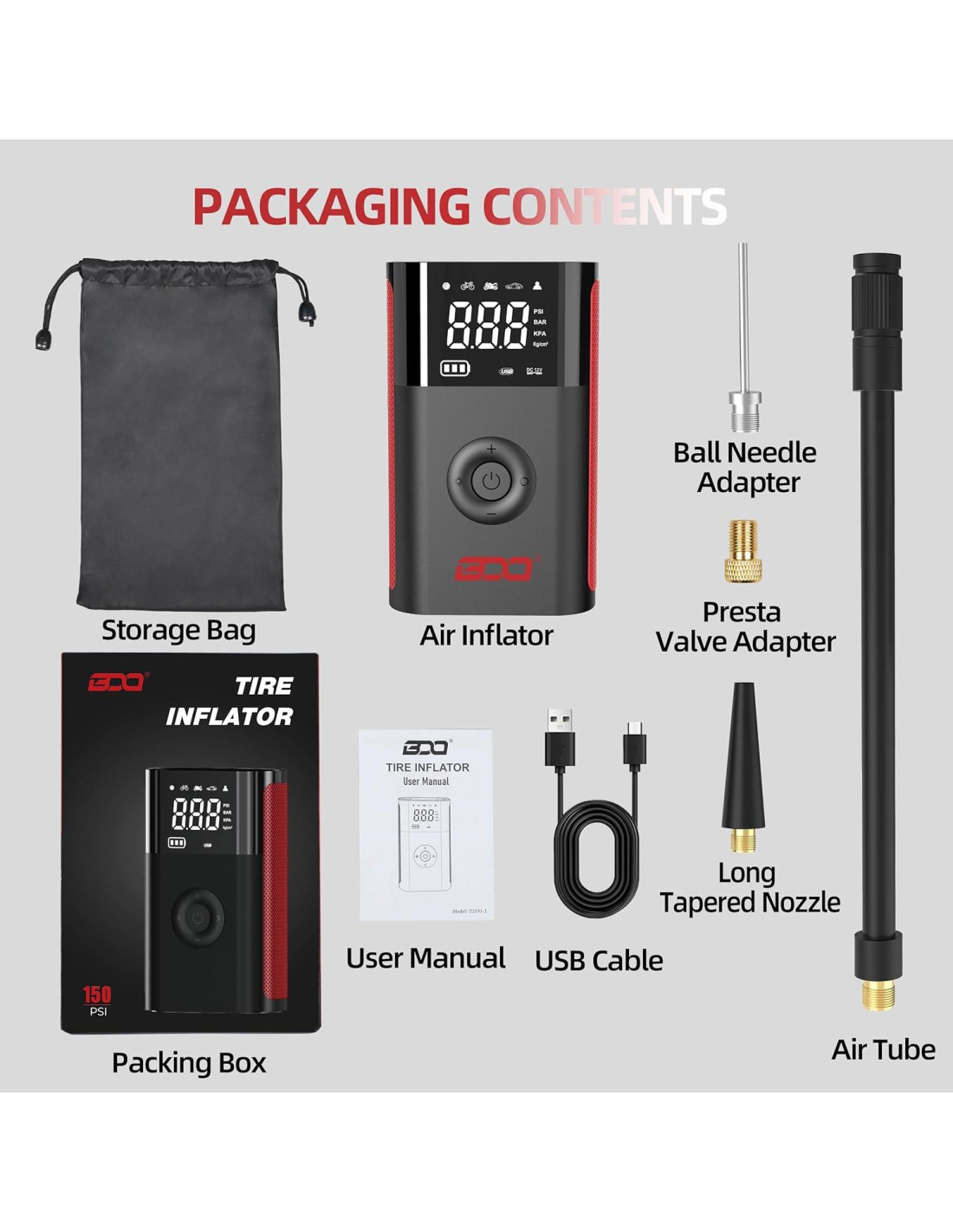 - el inflador de neumáticos equipado con un motor de alto rendimiento, el inflador de neumáticos ofrece una inflación rápida y eficiente. Con una presión máxima de 150 PSI, rellena un neumático de coche 175/70R14 de 0 a 35 psi en menos de 5 minutos.
