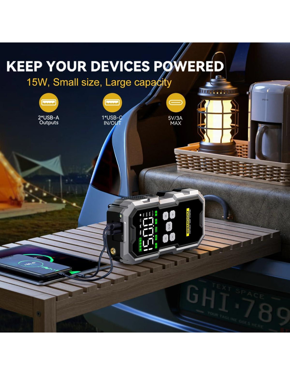 - Pantalla LCD Inteligente y 3 Modos LED Arrancador de coche portátil con una pantalla LED de 3.4 pulgadas que muestra el nivel de batería en tiempo real, modo de inflador, presión de neumáticos y 3 valores preestablecidos para un fácil monitoreo. Los cables de arranque de detección de seguridad inteligente se iluminan en verde cuando están correctamente conectados, asegurando una operación segura y simple. La luz LED integrada ofrece tres modos: iluminación normal, señal de emergencia SOS y advertencia estroboscópica, proporcionando iluminación esencial y señales de socorro en situaciones nocturnas o de emergencia.