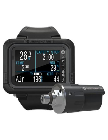 - Opción de Integración Inalámbrica de Aire con el Transmisor Shearwater Swift que permite datos de presión de gas en tiempo real y cálculos precisos del tiempo de gas restante.