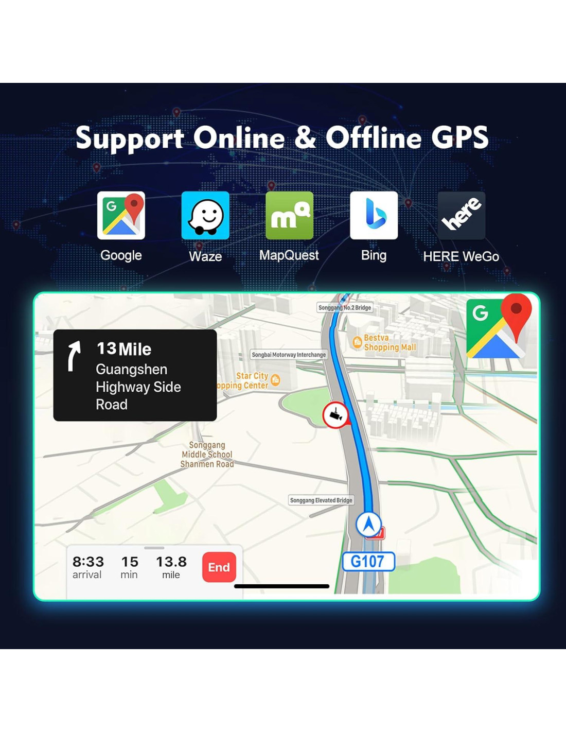 - CarPlay y Android Auto y MirrorLink: CarPlay por cable y Android Auto por cable. Usa el cable de datos USB original para conectar el teléfono Apple o Android. Sincroniza la APP del teléfono con la radio del coche y ejecuta navegación en línea en CarPlay o Android Auto en el estéreo del coche. Haz llamadas manos libres, envía/recibe SMS y escucha música/podcasts en CarPlay o Android Auto mientras te concentras en conducir. Puedes activar a Siri con tu voz o con un toque.