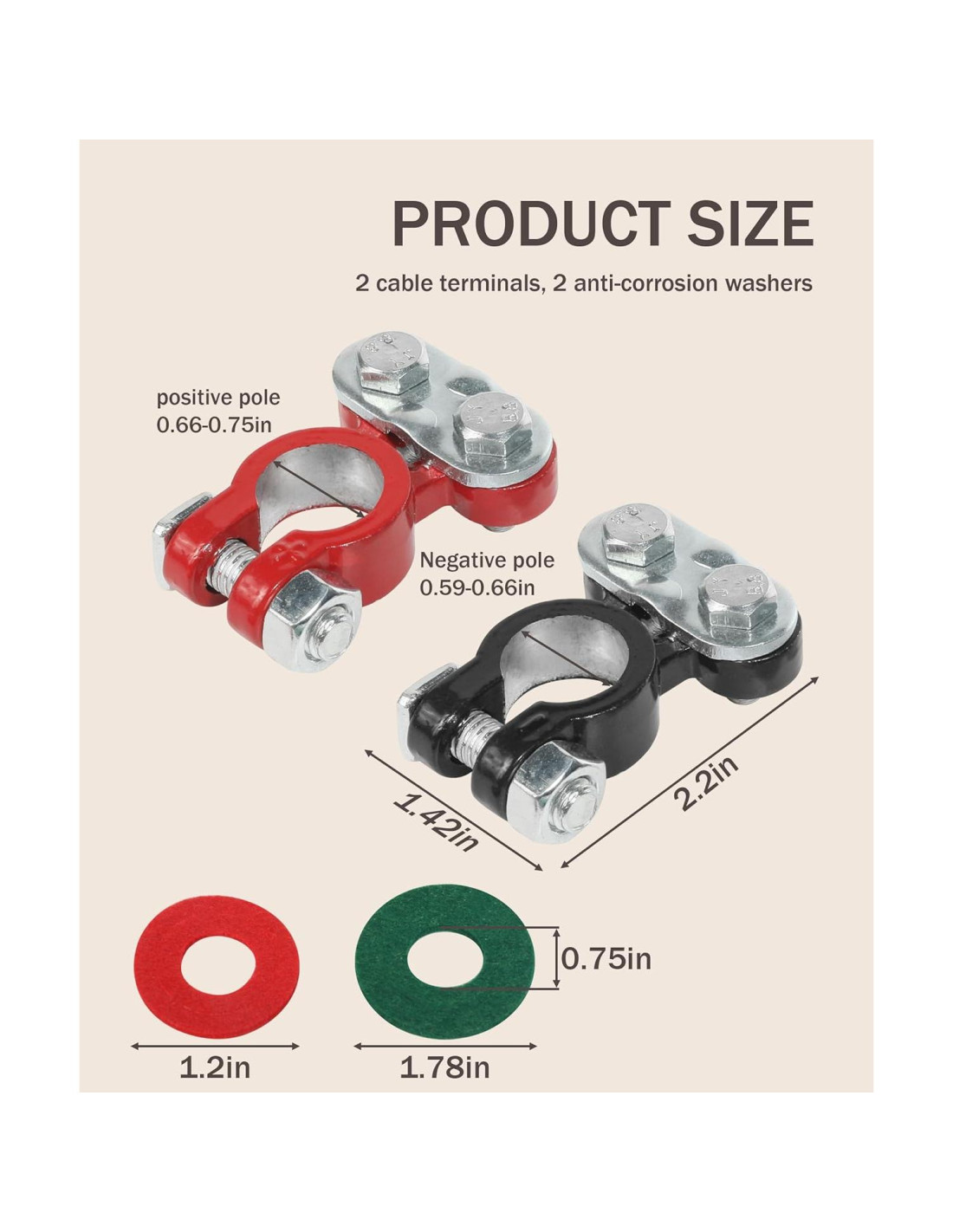 - [El paquete incluye] El paquete incluye 2 conectores de terminal de cable y 2 arandelas anti-corrosión, que pueden satisfacer tus necesidades diarias de uso y reemplazo.