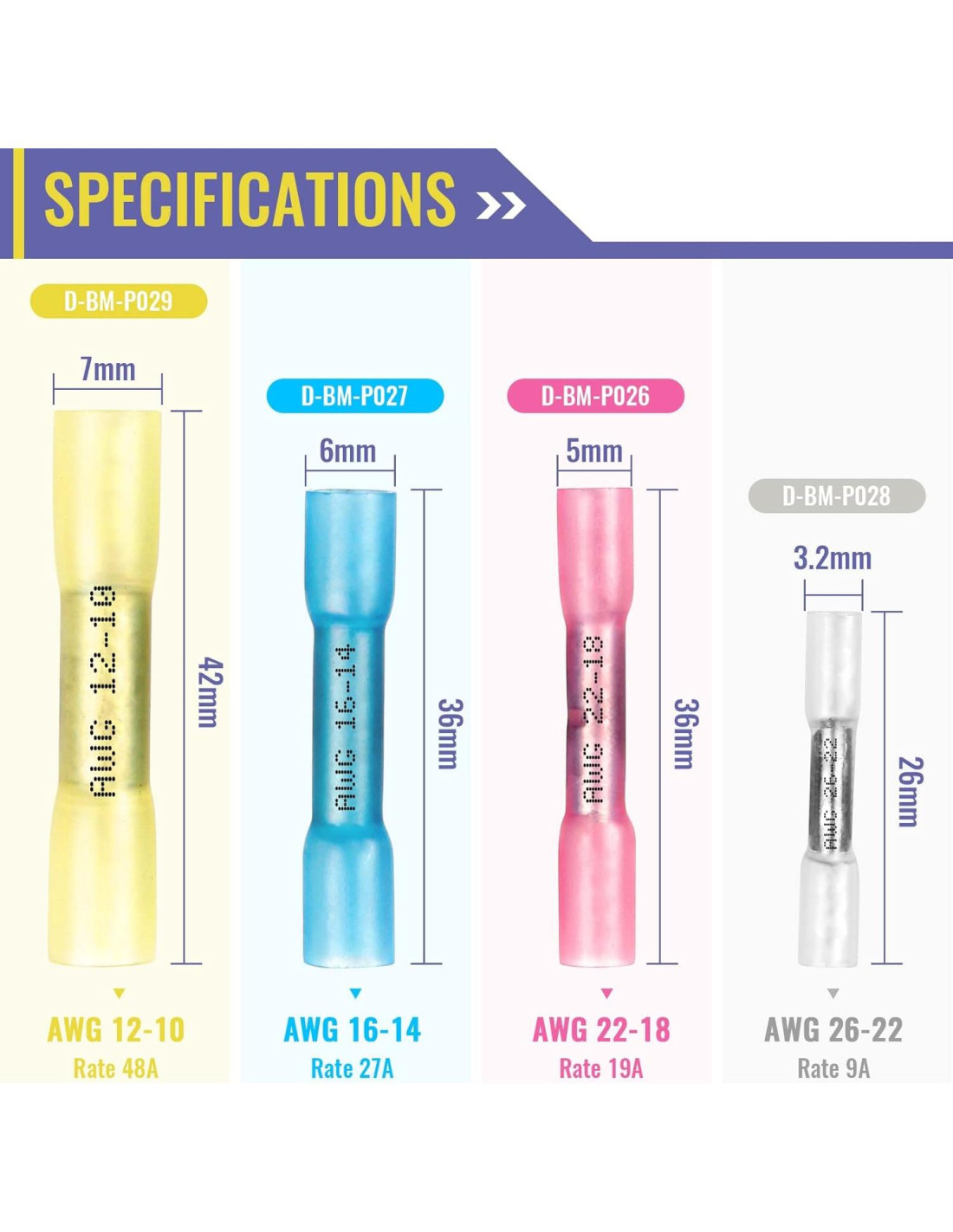 - DURABILIDAD Y SEGURIDAD: El tubo termorretráctil de poliolefina proporciona alta resistencia a la tracción y resistencia a la tensión y minimiza el daño mecánico, por lo que no hay preocupación por roedores o problemas de daño físico similares; El cobre estañado grueso y el diseño de barril sin costuras aseguran un crimpado fuerte y seguro todo el tiempo sin problemas de cables que se suelten