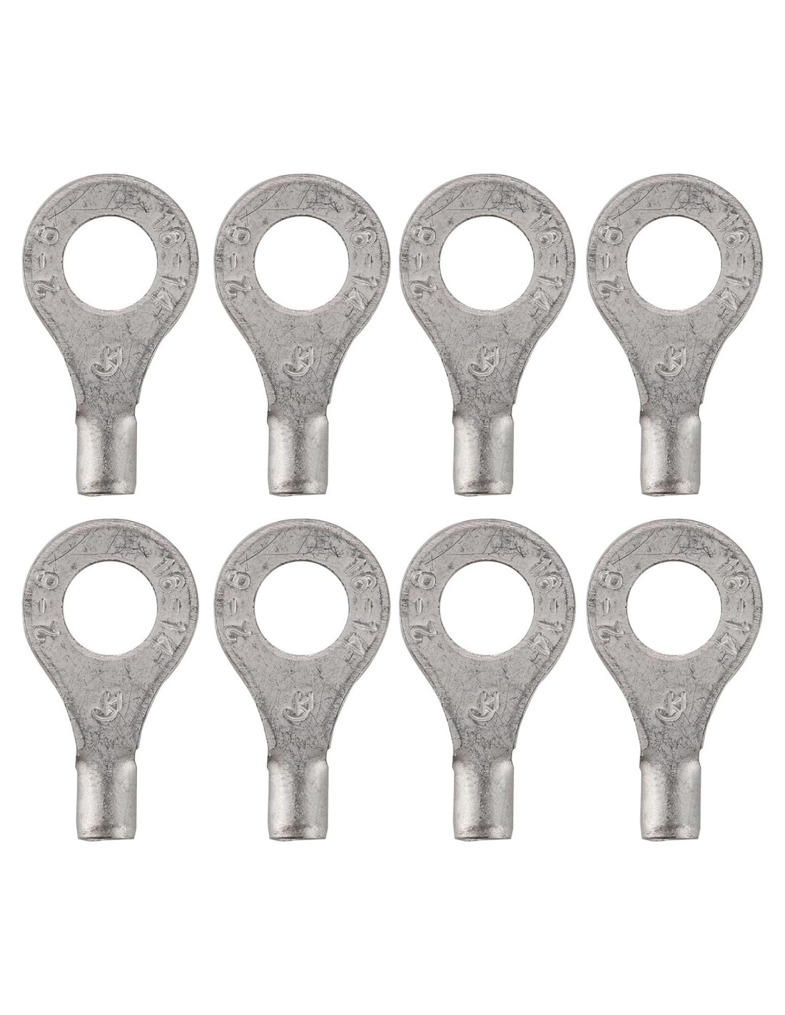 - Contenido del paquete -- Un paquete contiene 100pcs terminales de anillo no aislados para calibre de cable AWG16-14, tamaño de estudio de 1/4" (6.35mm) para conectar una variedad de componentes eléctricos y cables de batería. Los terminales de anillo tienen un diámetro interior de 6.2mm, un diámetro exterior de 12.0mm y una longitud de 21.85mm.