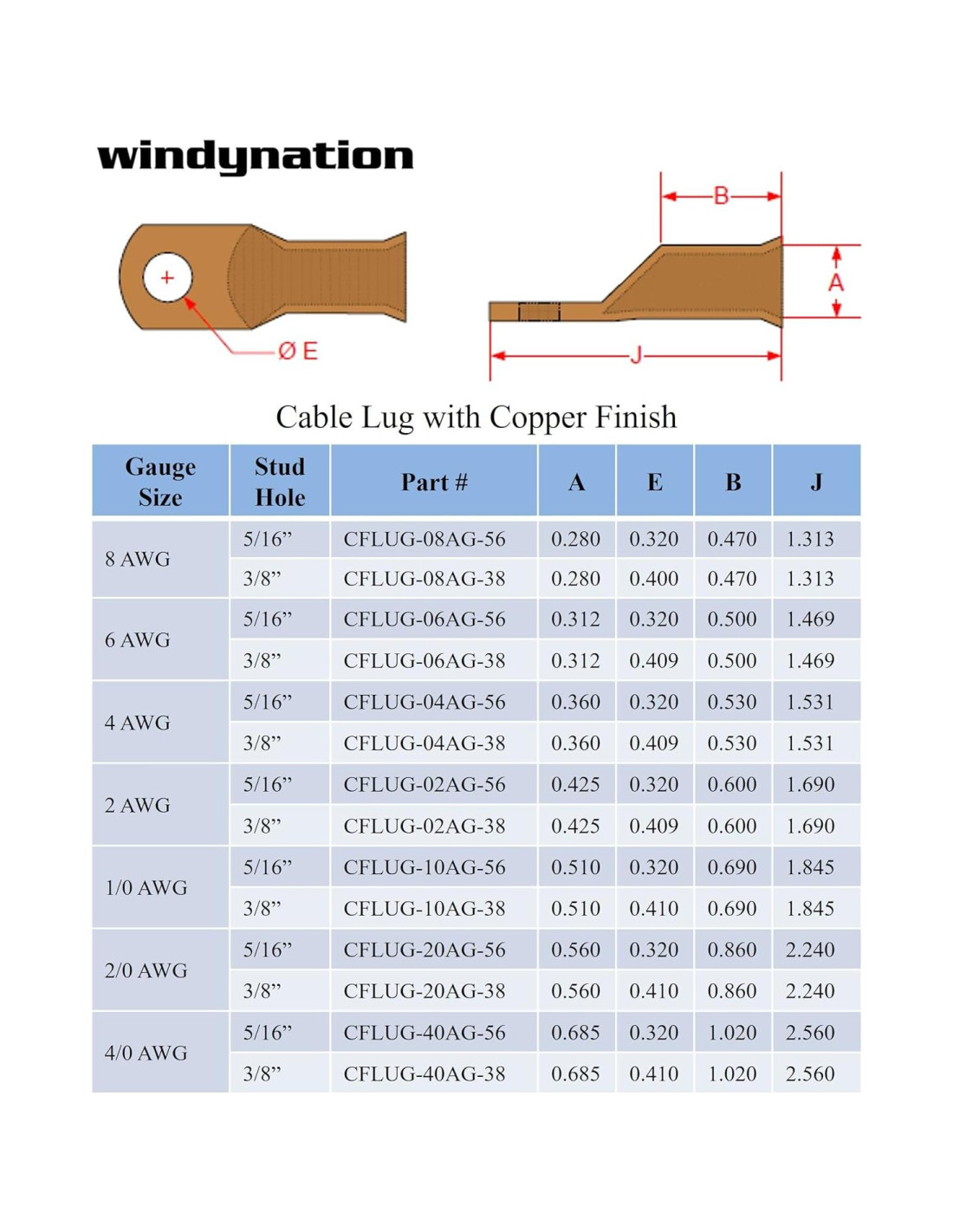 Los terminales de cable de cobre puro WNI son conectores eléctricos de alta resistencia, diseñados para aplicaciones de alta amperaje. Los terminales de cable de cobre puro recubiertos de estaño WNI son ideales para entornos marinos y húmedos porque el recubrimiento de estaño protege el terminal de cable de cobre de la oxidación y la corrosión. Los terminales WNI se fabrican en 7 tamaños de calibre diferentes, con agujeros para pernos de 3/8" (9.53 mm) o 5/16" (7.94 mm), y en acabado de cobre o recubierto de estaño. Tamaños de Calibre 4/0 Calibre | 2/0 Calibre | 1/0 Calibre 2 Calibre | 4 Calibre | 6 Calibre | 8 Calibre Tamaños de Agujeros para Pernos 3/8" (9.53 mm) | 5/16" (7.94 mm)