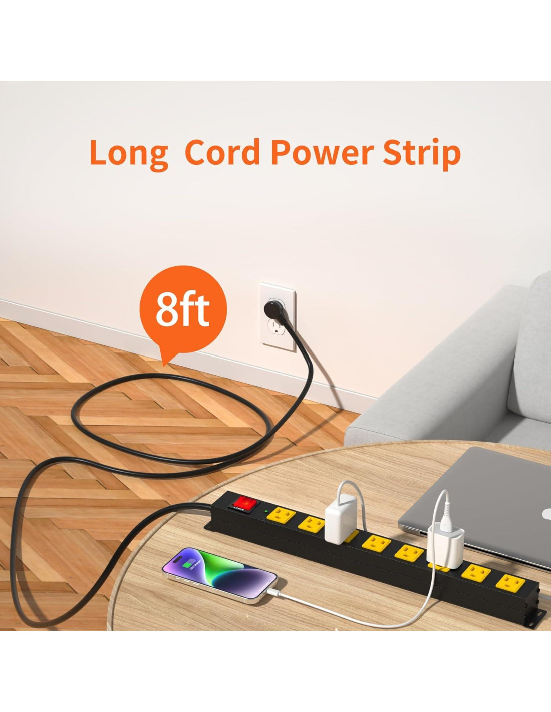 - Regleta de 8 salidas con separación amplia: Equipado con 8 enchufes y separación de 1.69" (4.29cm), perfecto para cargadores voluminosos y diferentes tamaños de enchufes. Longitud del cable de 8ft (2.44m) permite ajustar fácilmente la longitud del cable.