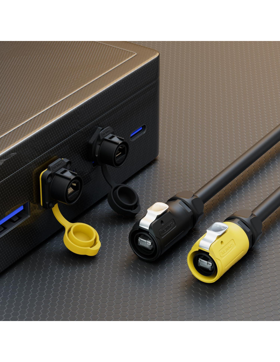 - Set RJ45 Amarillo de 4 Agujeros LP20: Este set amarillo incluye un conector macho RJ45 y un receptáculo de montaje en panel RJ45 con un socket de 4 agujeros. Cumpliendo con los estándares CAT6 con un puerto dual 8P8C, presenta un mecanismo intuitivo de enchufe/desenchufe para una experiencia sin complicaciones mientras asegura una conexión estable.