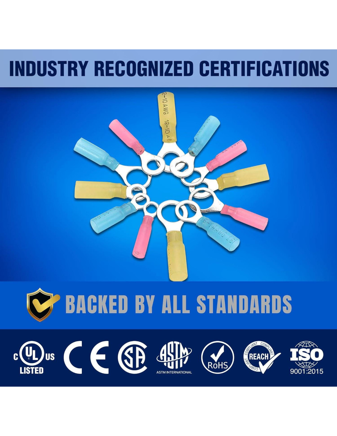 - [Aprobaciones Globales] Cada Conector de Anillo Termocontraíble de New Age America, Incluido en Nuestro Kit de Conectores de Cable y Conocido como Terminales de Anillo Termocontraíbles o Conectores Crimpados, Cumple con Estándares Rigurosos. Certificado y Listado Bajo UL, cUL, CE, REACH, RoHS, y Certificado según Normas ASTM, y Fabricado en una Instalación Calificada ISO, Estos Kits de Conectores de Cable Están Hechos de Cobre Estañado de Alta Calidad. Sus Certificaciones Completas Garantizan Todos los Requisitos de la Industria para Calidad y Seguridad
