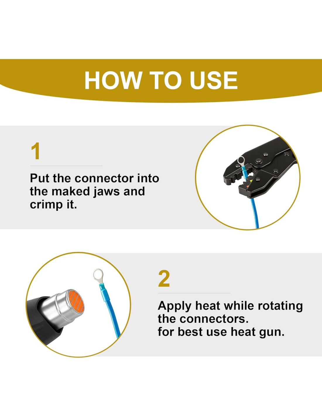 - FÁCIL DE USAR: Para usar el conector de cable eléctrico, selecciona el correcto según el tamaño AWG de tu cable, que está codificado por colores e impreso en cada conector. A continuación, utiliza una pistola de aire caliente para aplicar calor. Es importante calentar el conector de manera uniforme para evitar quemaduras. Continúa este proceso hasta que veas que el conector se contrae y el adhesivo en su interior comienza a fluir, llenando cualquier espacio. Estos conectores termoretráctiles aseguran un sellado completo e impermeable del terminal, proporcionando una conexión segura y duradera.