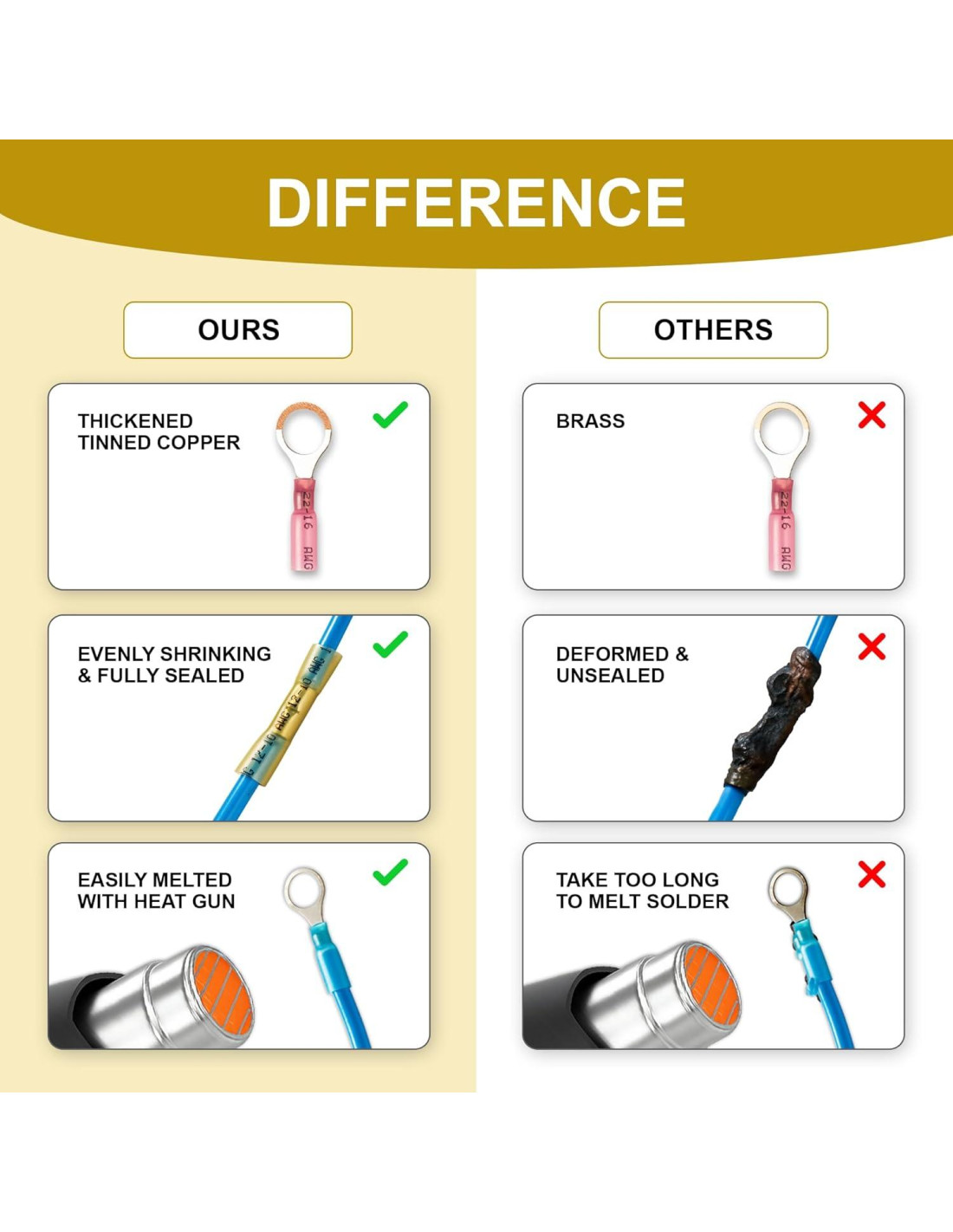 - CALIDAD DE CONSTRUCCIÓN Y DISEÑO: Los conectores de crimpado están hechos de cobre estañado grueso, que es altamente conductor y resistente a la corrosión. El barril es una sola pieza de cobre para asegurar un crimpado seguro y permanente y prevenir el deslizamiento del cable. Este diseño de conector de cable proporciona una relación de contracción de 3:1 y, cuando se calienta, crea un sellado seguro, retardante de llama e impermeable de 360 grados, lo que los hace adecuados para entornos exigentes como el cableado subterráneo.