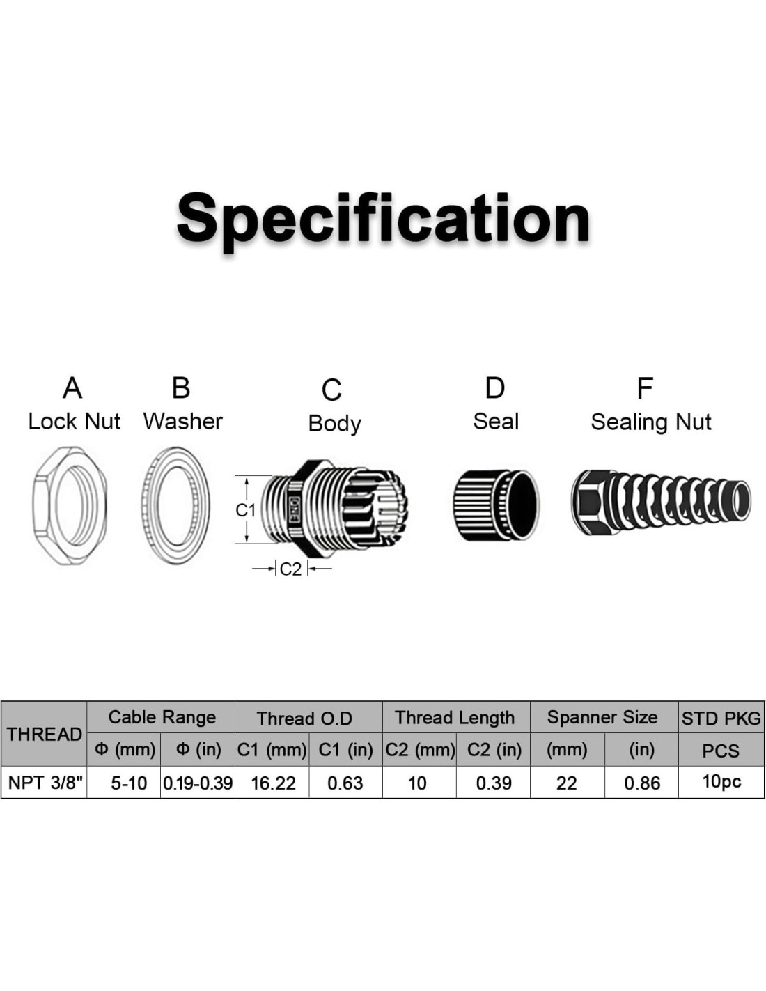 - Rosca de Gland NPT: El kit de glándulas de cable tiene un total de 10 paquetes de NPT 3/8". Rango ajustable de alivio de tensión para cables y alambres que se conectan a equipos eléctricos, incluidas cajas de conexión. El diseño en espiral proporciona una mejor protección para los cables.