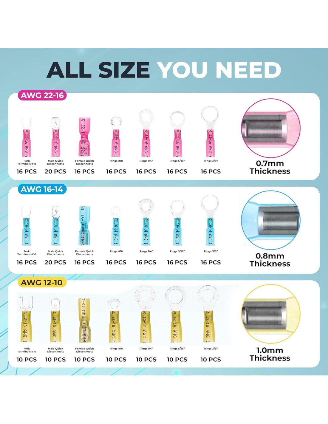 - [TIPO y TAMAÑO] El surtido de conectores incluye conectores rojos, azules y amarillos que se pueden usar en cables AWG de 22 a 10, (AWG16-14 22-18 12-10). Siete tipos de terminales: Conector de anillo (tamaño de perno: #10, 0.25 pulgadas (0.64 cm), 5/16 pulgadas (0.79 cm), 3/8 pulgadas (0.95 cm)), conector de desconexión rápida hembra, conector de desconexión rápida macho y conector de horquilla (tamaño de perno: #10).