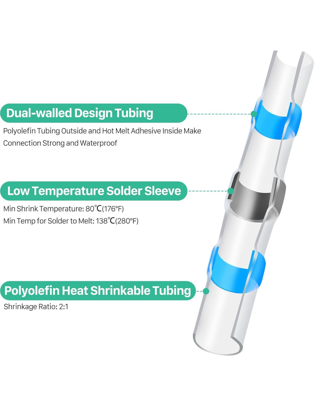 - Anillo de Sello de Soldadura Premium: utiliza material exclusivo en los conectores eléctricos para evitar que el tubo de contracción se derrita antes de soldar. Asegura una conexión duradera para tu aplicación