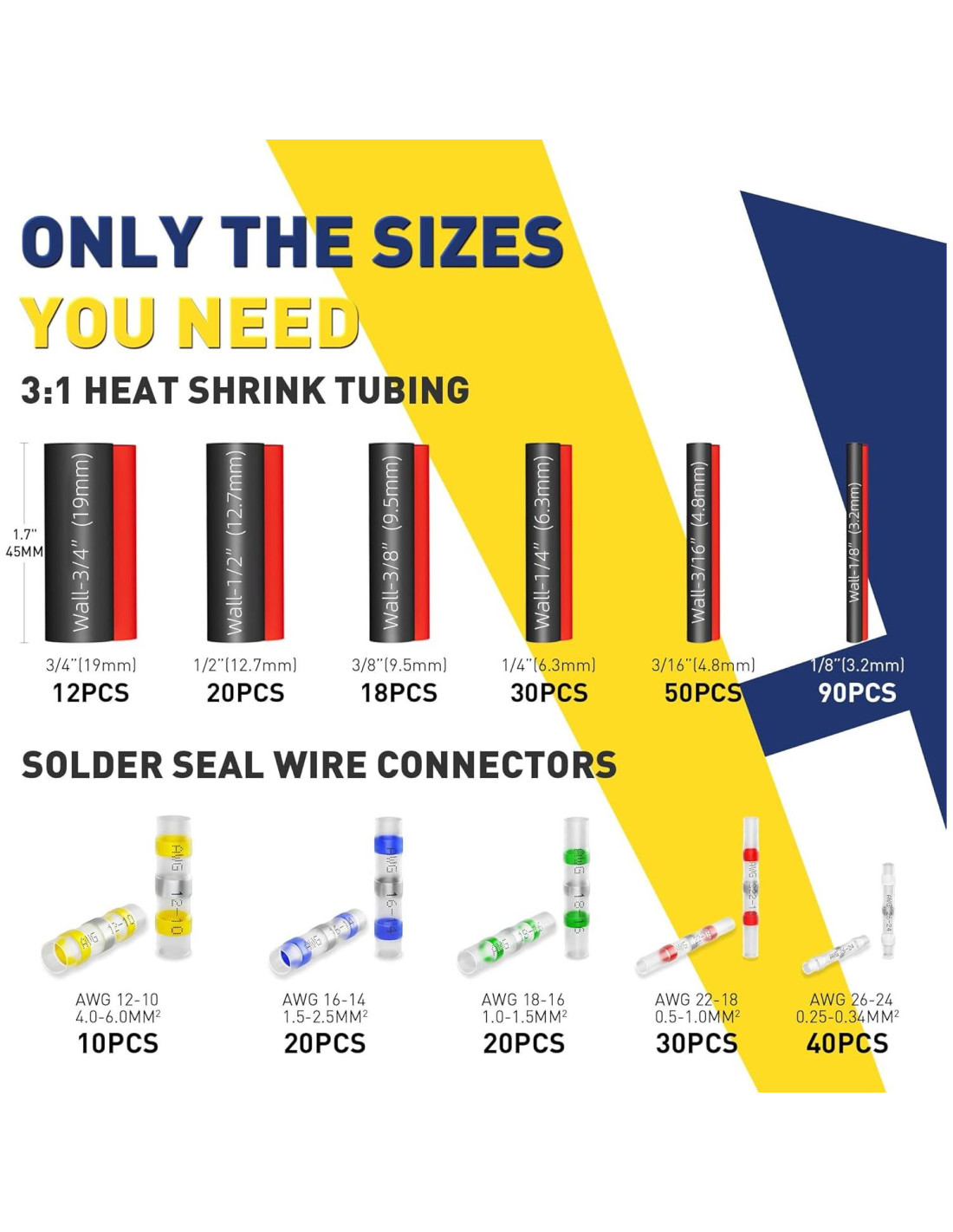 - Kit Total de 340PCS: Incluye 10-26 AWG 120PCS conectores de cable con sellado de soldadura y 220PCS tubos termocontraíbles 3:1. Este kit todo en uno cubre todo lo necesario para conexiones eléctricas seguras, aisladas e impermeables en proyectos automotrices, marinos, de remolque y de reparación del hogar