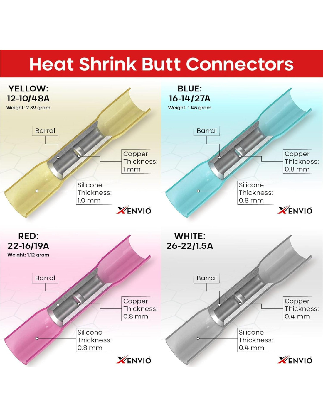 - Núcleo de Cobre de Alta Calidad: Nuestros conectores de empalme incluyen un barril de cobre estañado grueso que asegura un crimpado firme y seguro de manera constante. Los barriles de cobre gruesos tienen los beneficios de reducir la pérdida de voltaje, permitir un alto flujo de corriente y generar poco calor. Estos protegerán tu conexión, evitarán cortocircuitos y mejorarán su seguridad.